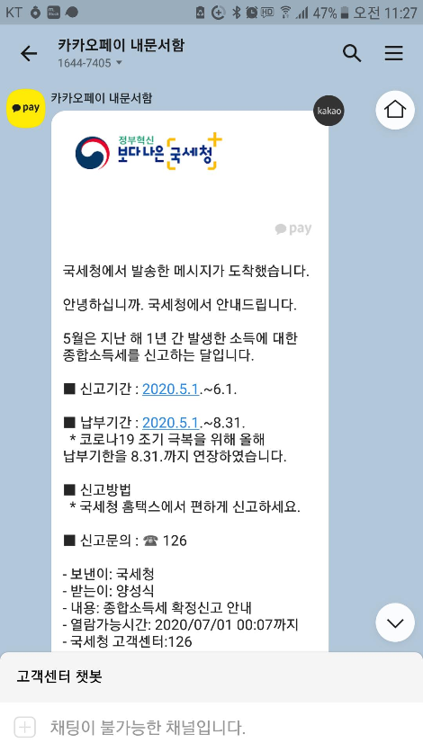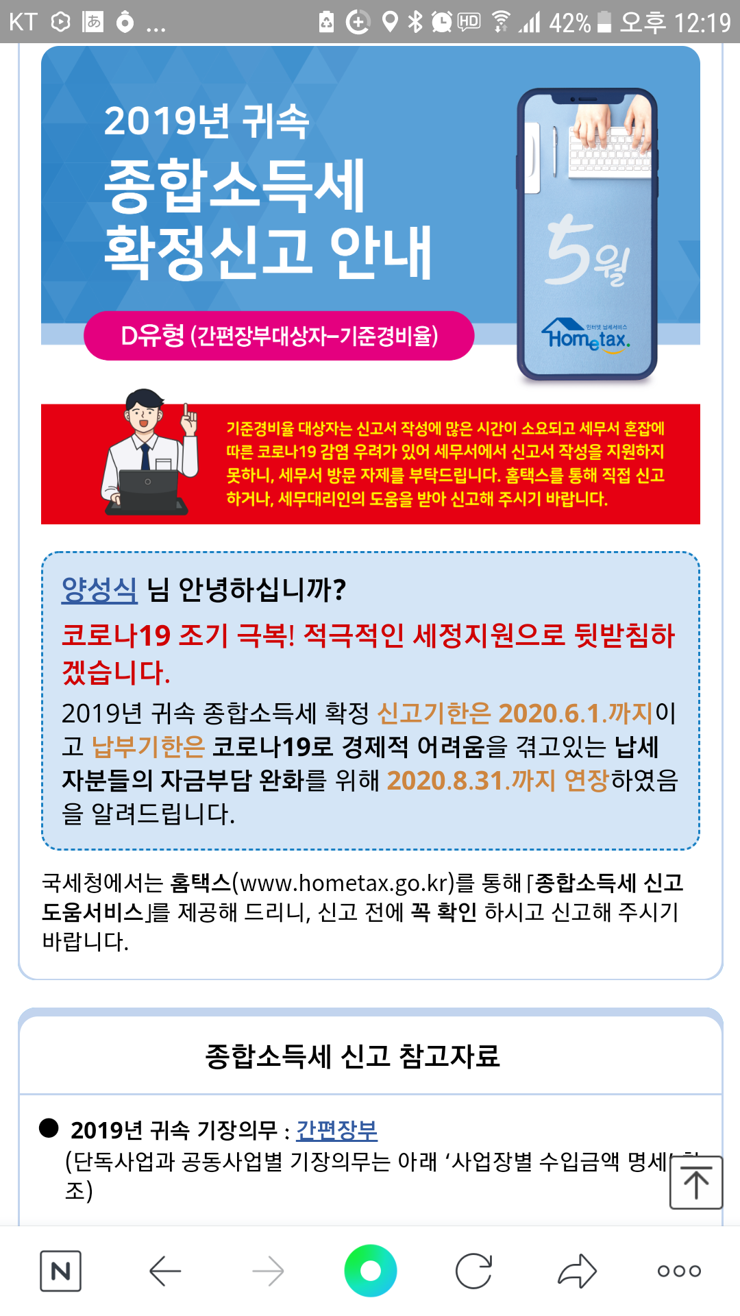 1인지식기업가로서 첫 해부터 수입이 발생했고 퇴사 다음해부터 어김없이 국세청으로부터 종합소득세 신고를 하라는 안내문이 우편으로 날아오기 시작했다. 최근에는 카카오페이 내문서함으로 안내가 온다.