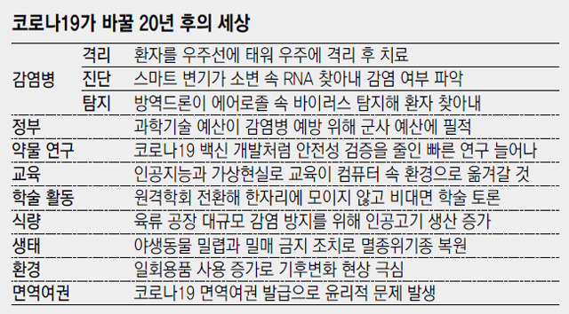 과학자들의 20년 후 상상 속 세상 중 가능성이 가장 높은 미래시나리오는 어떤 것일까요? 대부분 현실이 될 가능성이 있는 시나리오이긴 하지만 그 중에서도 저는 환경부분에서 '일회용품 사용증가로 기후변화 현상 극심'이 아닐까 생각해 봅니다. 그리고 접촉을 꺼리는 분위기가 지속된다면 당분간은 대중교통보다 자차를 이용하는 사람이 늘어나서 온실가스 배출량도 늘어날 가능성이 높지 않을까요?
