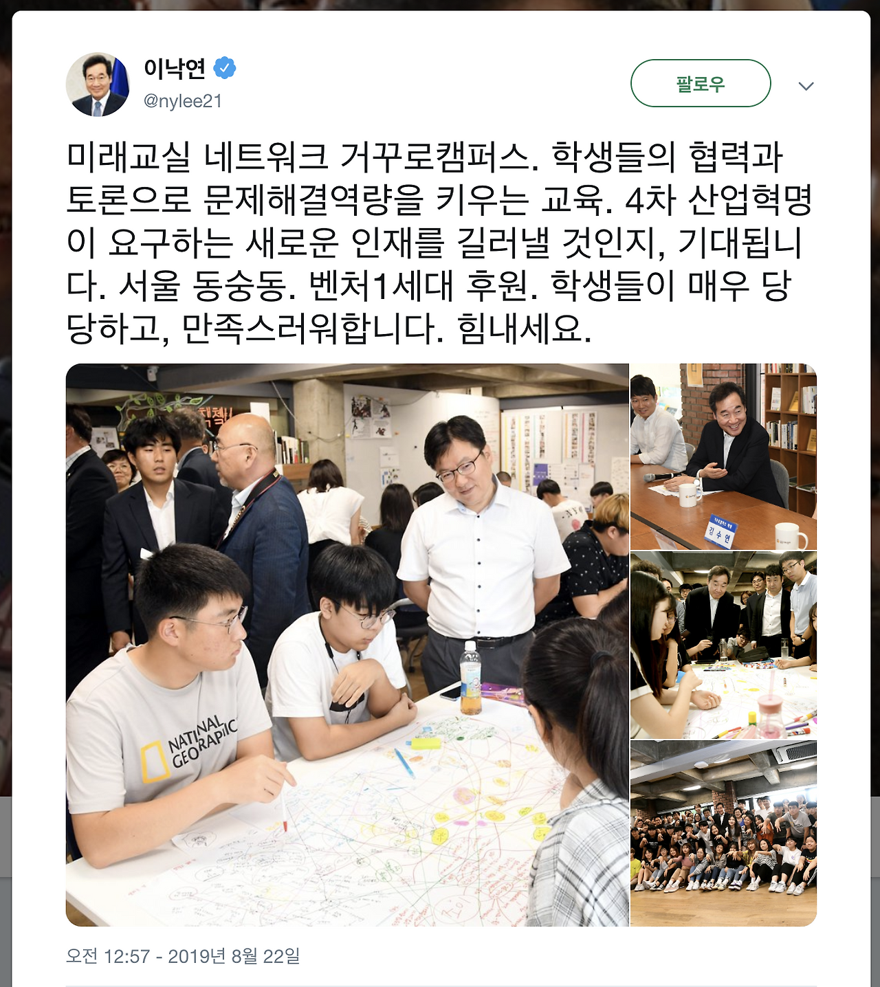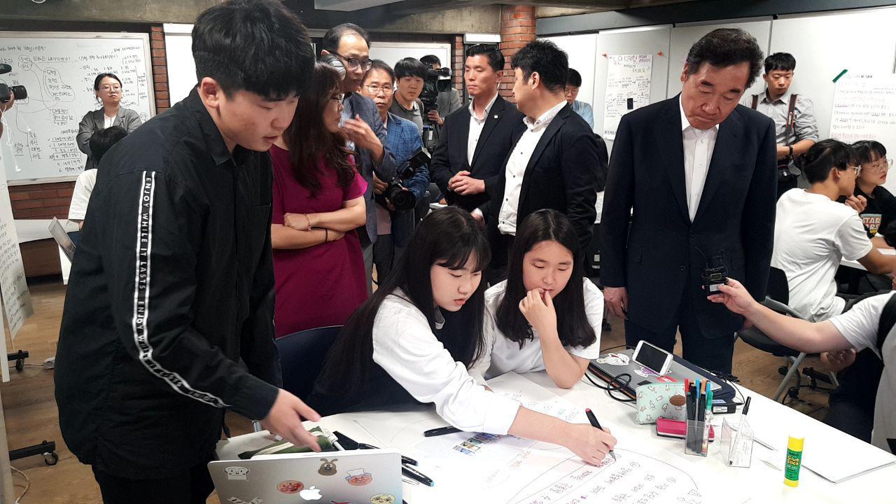 8월 22일 목요일 오후 3시 서울시 종로구 동숭동 거꾸로캠퍼스를 찾은 이낙연 총리는 (사)미래교실네트워크와 정찬필 사무총장의 간단한 설명을 들은 뒤 교실을 방문했습니다. 교과맵과 사최수프 활동이 한창이었죠.