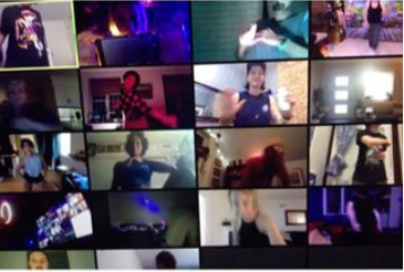 클럽처럼 DJ가 음악을 믹싱하고 참가자들은 각자 집에서 음악에 맞춰 신나게 춤을 춥니다. 다른 공간에 있어도 Zoom을 통해 춤추는 모습을 서로 볼 수 있어 흥미롭습니다.