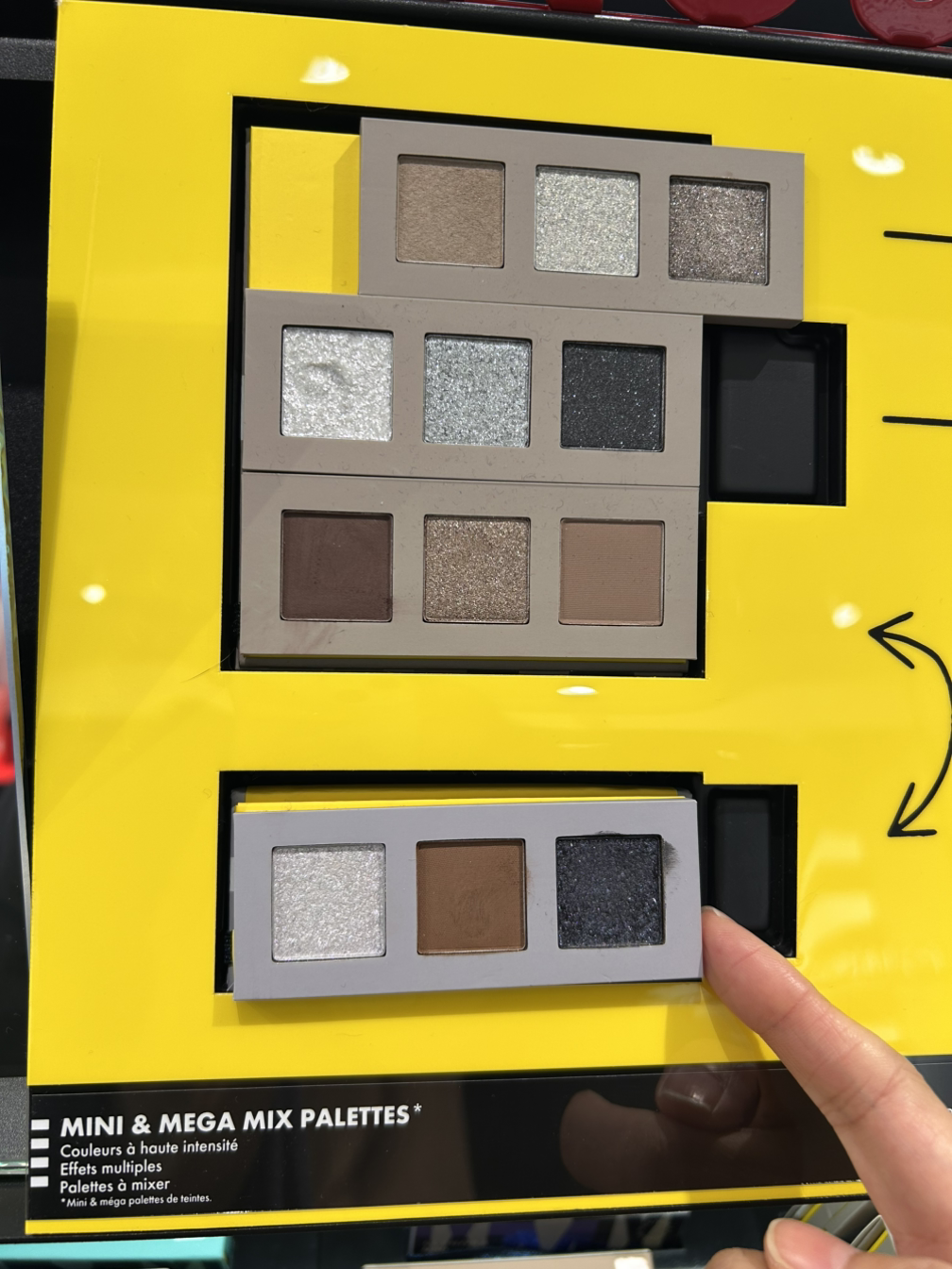 신제품이라 곤돌라 위치 중에서도 가장 상단에 비치해 놓았는데, 3구를 자석 형식으로 끼우는 타입으로 팔레트를 구성 / 이걸 보면서도 느꼈지만 사용량 때문인지 모르겠지만 섀도 사이즈(양) 자체가 우리나라와 큰 차이가 있어요. 대체적으로 글로벌 브랜드들은 섀도 하나의 크기가 한국보다 큰 편이라 오히려 우리에게는 한국 스타일이 나은 거 같음