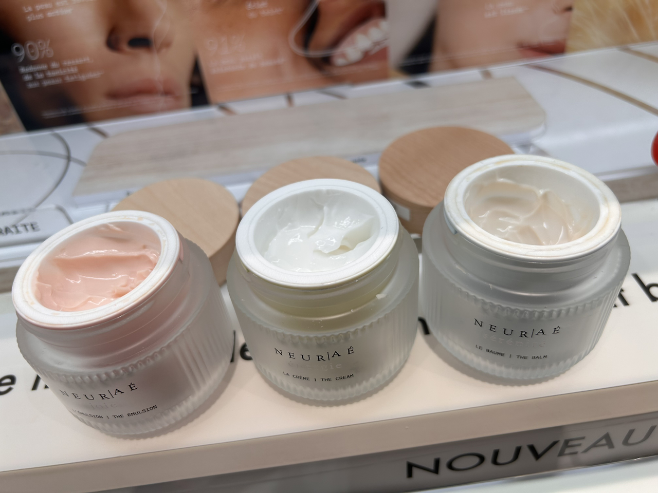 이 제품은 세럼과 크림이 주력이었는데, 크림의 경우 용기 외관 컬러 플레이를 엄청 잘했더라고요. 기능적으로 달리 소구 하는 점이야 당연하지만 3종 크림을 이렇게 모아서 진열해 놓으니 보기도 좋고, 궁금증도 생기고요, 일부러 내용물 제형도 찍었는데, 3종 중 핑크 제외하고 나머지 2종(그린/블루)은 용기 외관에서 느껴지는 내용물 색상과 다른 색