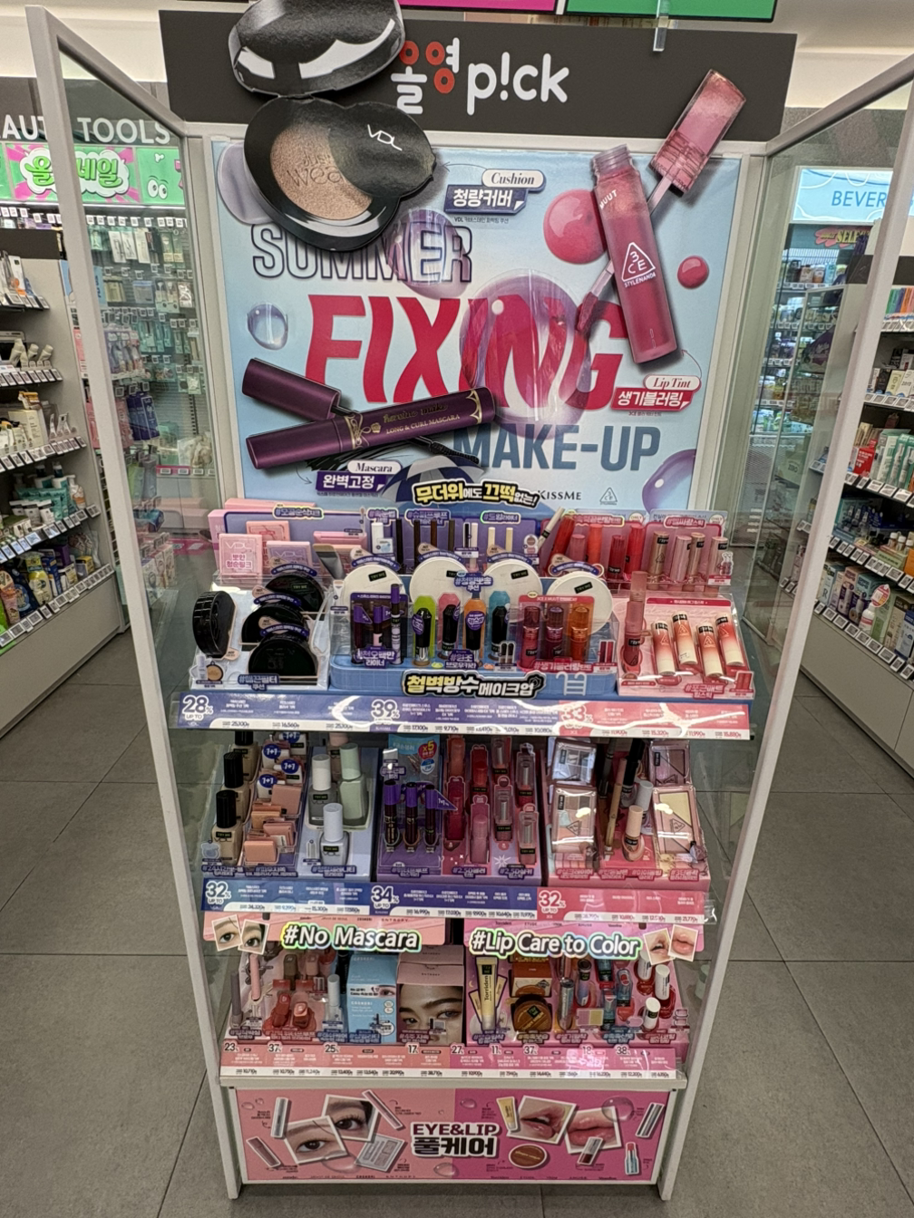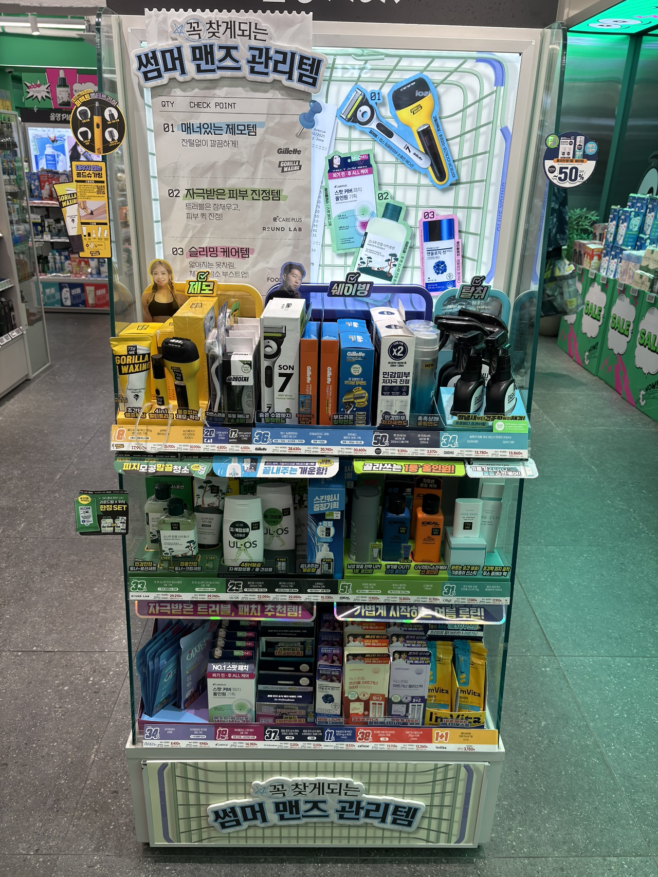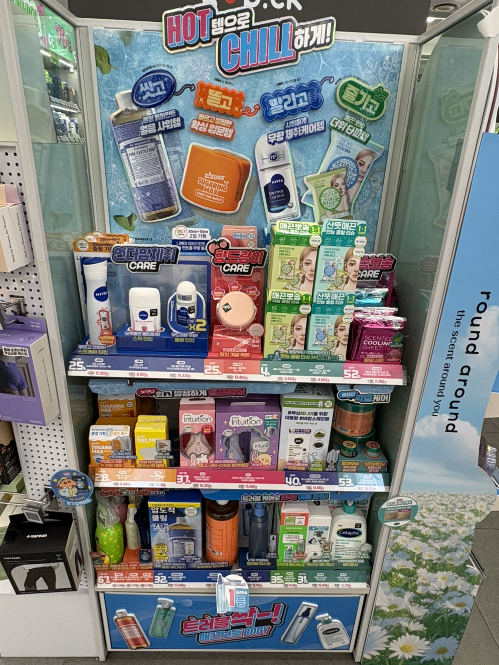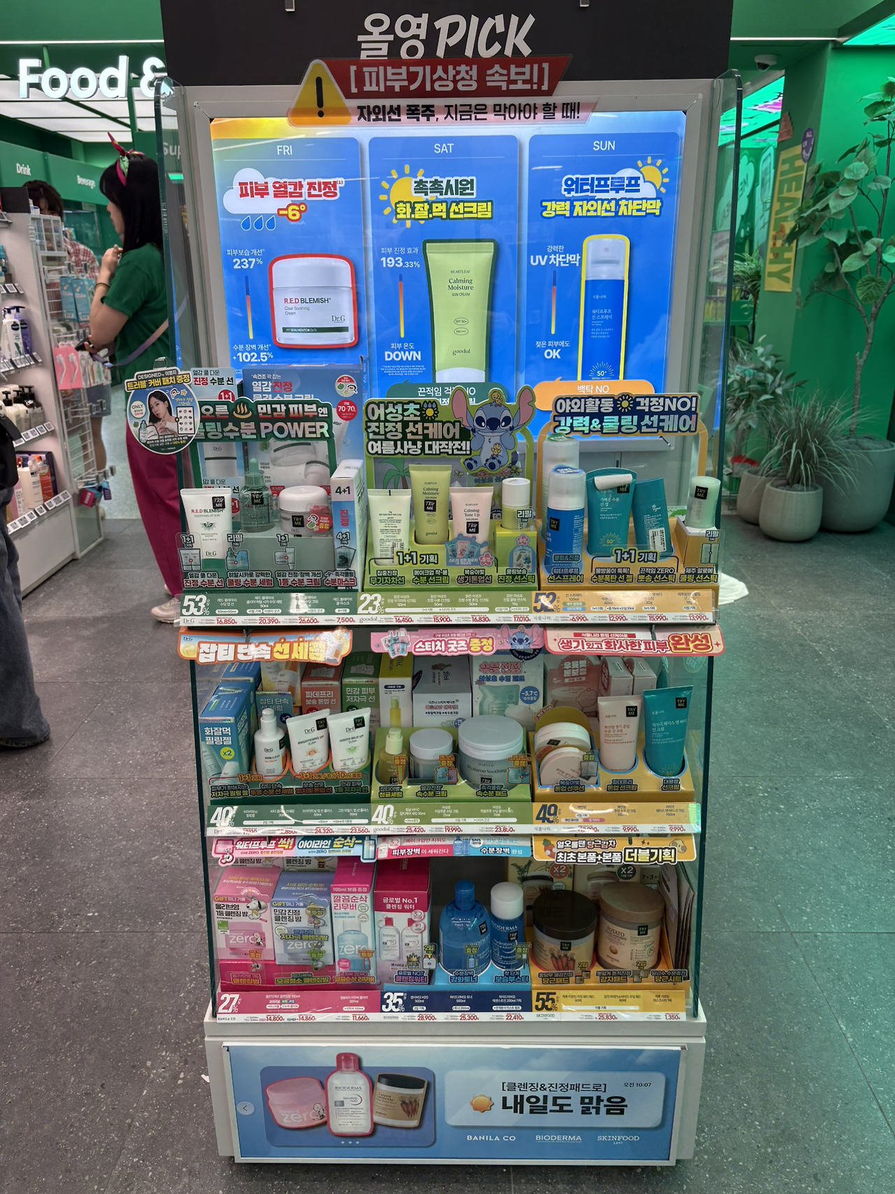 이번 매대는 선케어와 클렌저 포함 스킨케어 등 아주 짬뽕 매대네요.