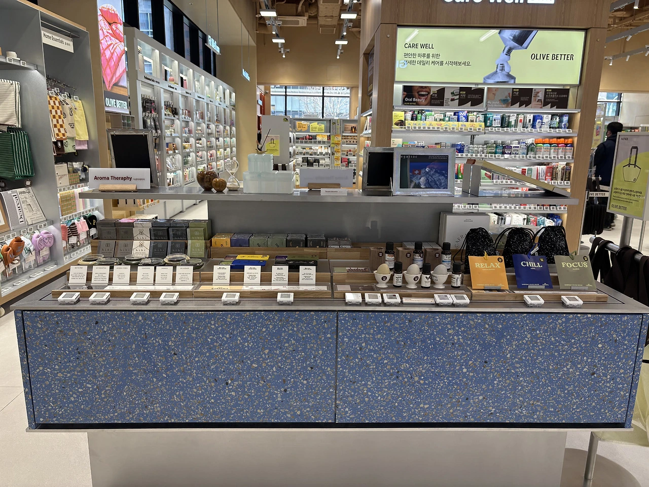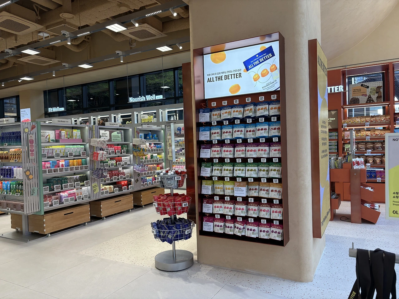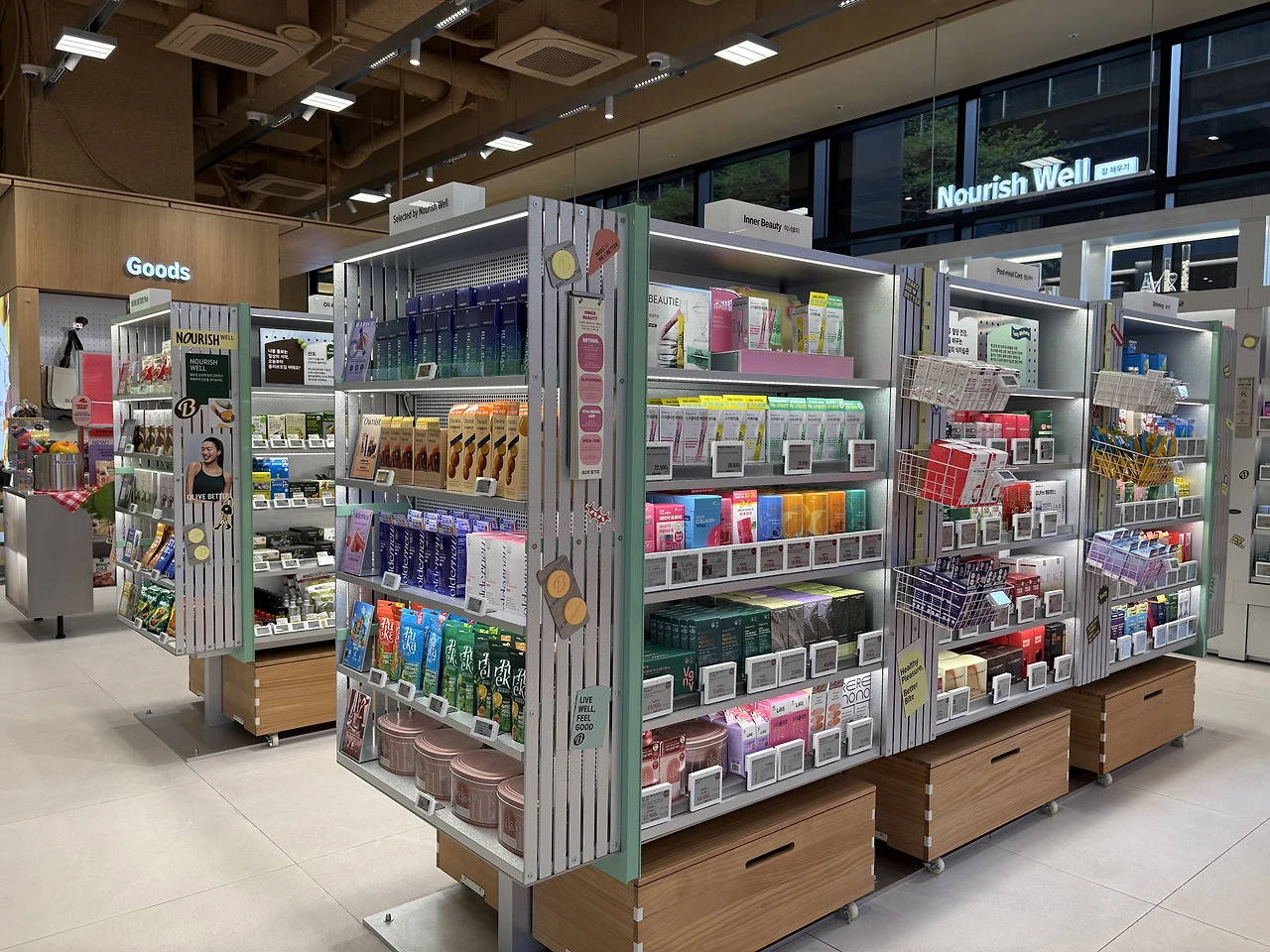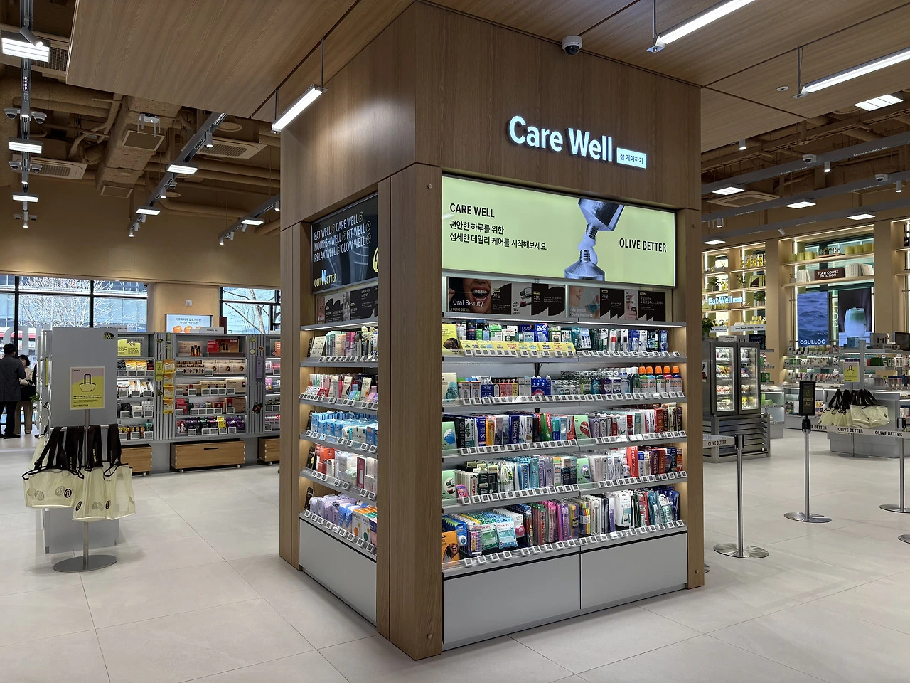 웰니스 플랫폼이다 보니 화장품을 매장 전면에 노출한다면 일반 올리브영 매장과 큰 차이가 없게끔 소비자가 느낄 것이므로 당연히 안쪽에 품종 배치를 진행했을 겁니다.