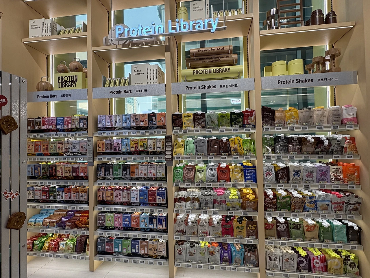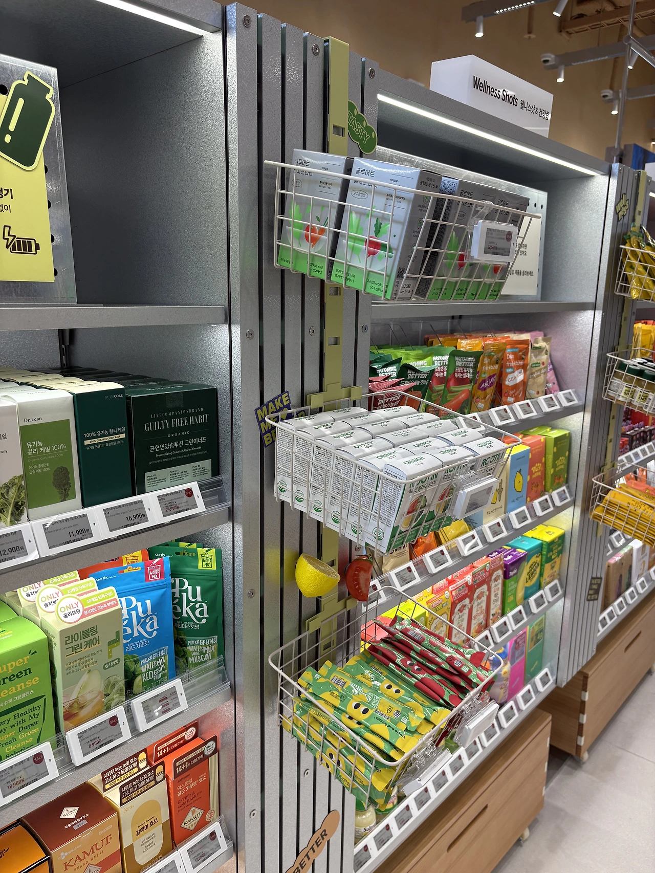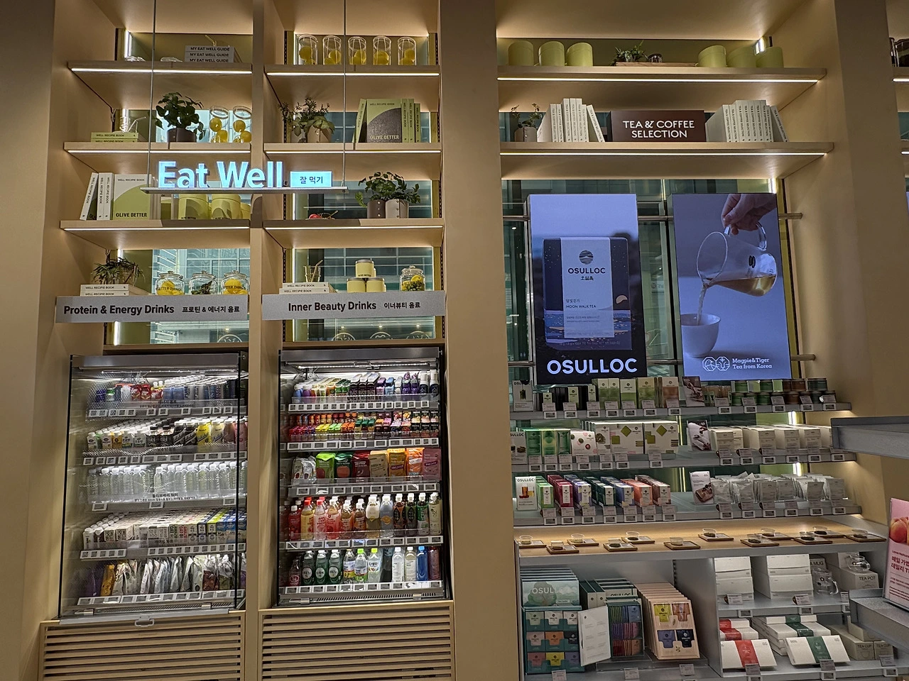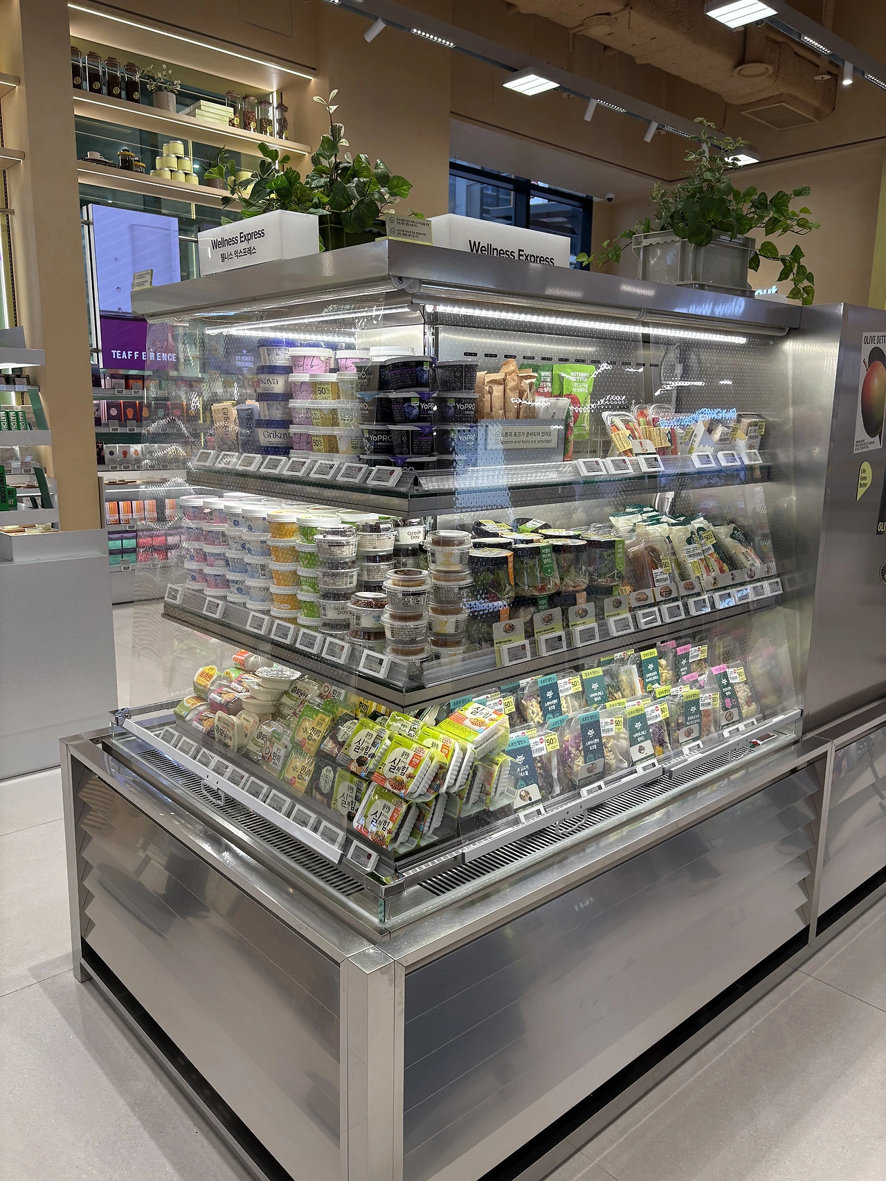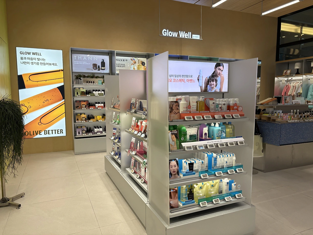 웰니스 플랫폼이다 보니 화장품을 매장 전면에 노출한다면 일반 올리브영 매장과 큰 차이가 없게끔 소비자가 느낄 것이므로 당연히 안쪽에 품종 배치를 진행했을 겁니다.