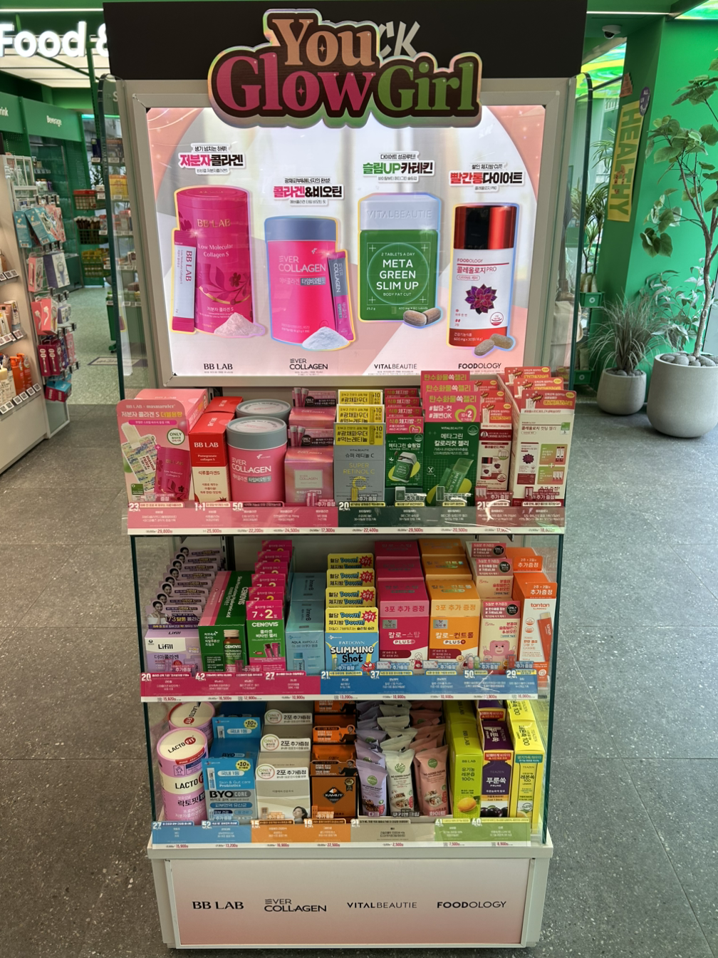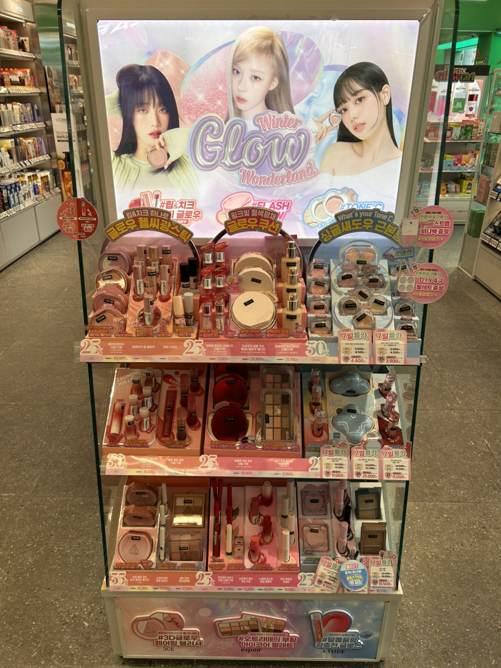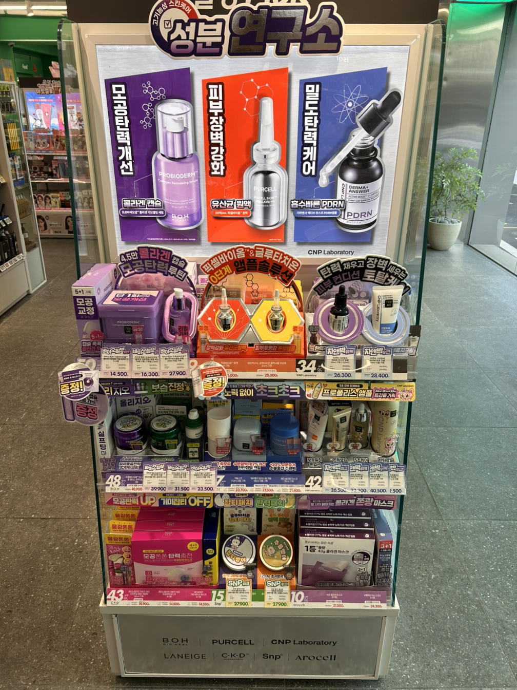 이 매대는 세럼이라는 동일한 카테고리로 최상단 주요 제품을 구성했고, 제품의 기능과 성분을 함께 보여줌으로써 요즘스러운 플레이로 준비를 하였음을 알 수 있습니다.