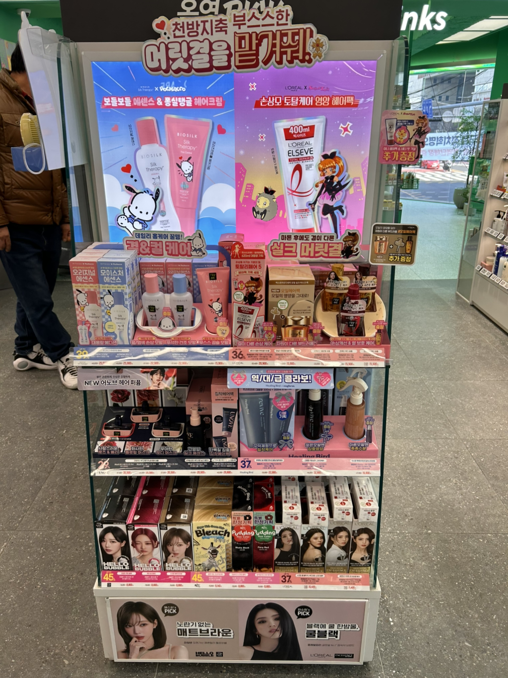 최하단에는 제품 사이즈가 있는 염모제를 운영하고, 1단에는 헤어 케어의 주력 브랜드인 실크테라피와 로레알 제품을 운영하고 있습니다.