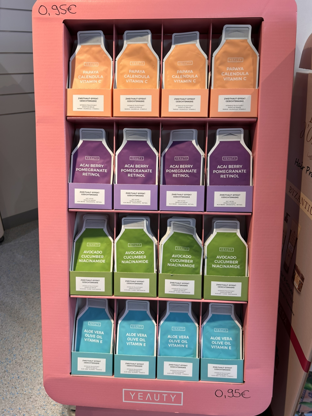 0.95 유로에 판매되고 있는 마스크를 봤는데, 4가지 제품의 소구 성분이 궁금하더군요.