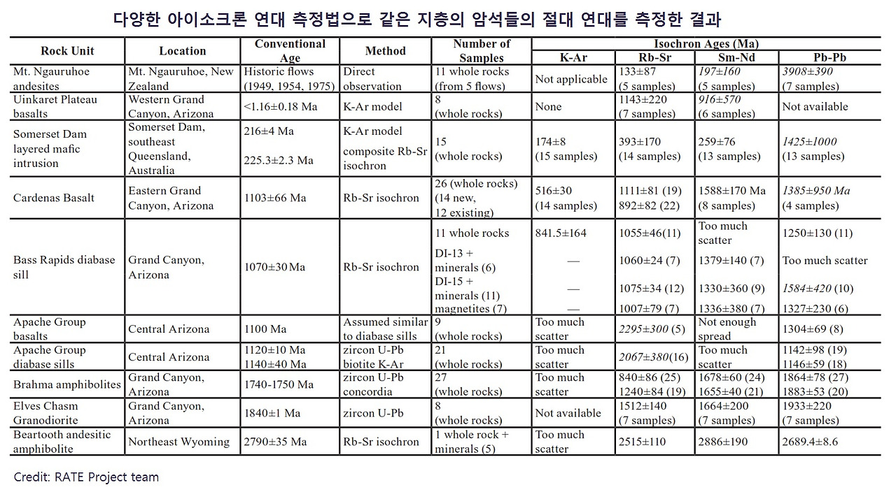 제일 첫번째 뉴질랜드 암석들은 화산이 언제 폭발했는지 아는 (직접 목격한) 경우 입니다. Pb-pb 결과 보시면 39억년 전으로 나옵니다. 아주 정확하죠? 연대 측정이 정확성을 인정받으려면 정확한 사례를 제시하는게 아니라 정확하지 않은 사례들이 없어야 합니다. 공을 떨어 뜨리는데 지표면에서 100번 떨어뜨려서 80번은 떨어지고 20번이 올라갔는데, 80번 정확한 것을 제시하고는 만류인력 법칙이 정확하다고 말하면 사람들이 이상하게 생각합니다.
