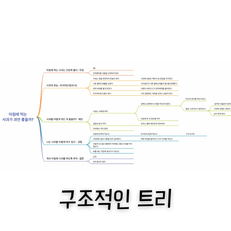 이번에는 ‘아침에 먹는 사과가 과연 좋을까?’라는 글감을 트리 구조에 입각하여 또 생각을 자유롭게 정리해 보겠습니다. 다만 트리처럼 생각을 커다란 가지에서 작은 가지로 전개해야 합니다.