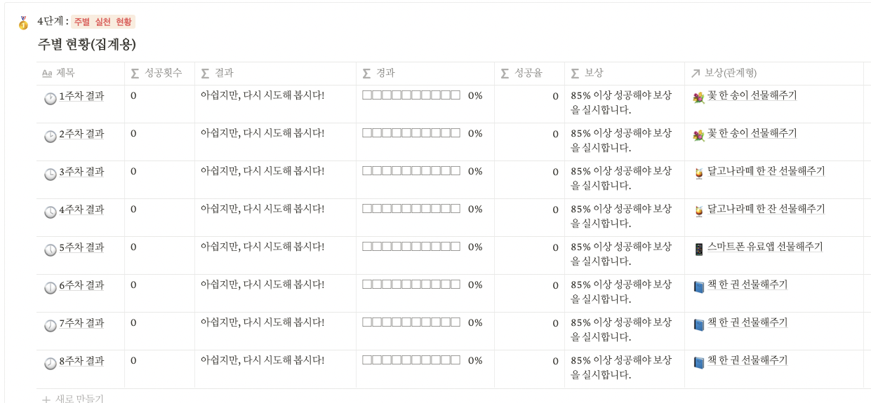 왜, 관계형으로 묶었는가 하면, 매주는 총 7일로 나뉘어 미시적 목표를 단계적으로 실천하게 되어 있는데, 그날그날 실행 여부를 체크하면(1일 성공... 7일 성공) 4단계 주별 실천 현황 데이터베이스에 진도 상황, 결과를 자동으로 집계되도록 개발(?)되었기 때문입니다.