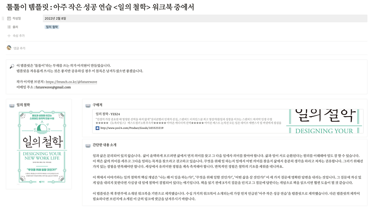 이상, <일의 철학> 워크북을 참조하여 만든 노션 템플릿을 소개해 드렸습니다. 반응이 좋으면 <일의 철학>에서 제공하는 다른 워크북도 노션 템플릿으로 제작해 보도록 하겠습니다.