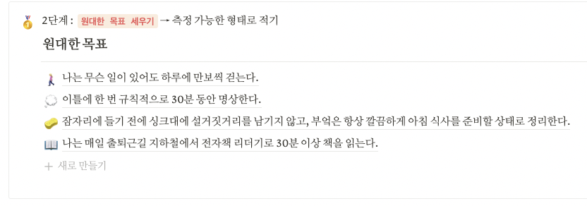 이 템플릿은 책 후반부에 소개된 워크북을 기반으로 제작됐습니다. 수십 가지의 워크북이 소개되는데 가장 먼저 언급된 ‘아주 작은 성공 연습’을 템플릿으로 제작했습니다. 다른 템플릿의 제작이 필요하다면 브런치에 소개된 이 글의 링크에 댓글을 남겨주시기 바랍니다.