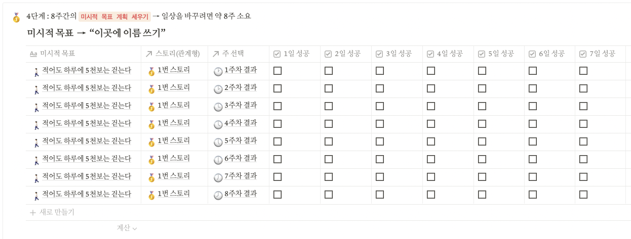 8주 동안 미시적 목표를 실천하면서 성공 유무를 체크만 하시면 됩니다. 간단합니다.