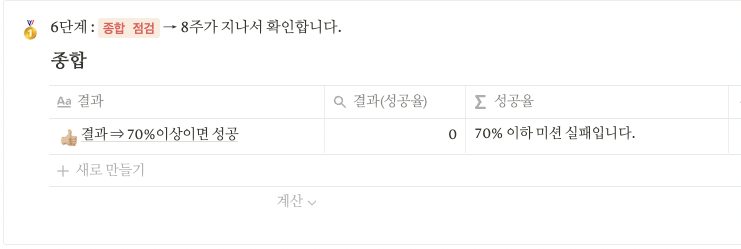 8주가 지나면 종합적인 점검을 진행합니다. 8주 * 7일 = 56회에서 약 70%를 성공하면 성공으로 간주한다고 합니다. 종합 점검은 매일 기록하는 4단계의 '미시적 목표 세우기' 항목에서 체크만 하시면 자동으로 계산하게 됩니다. 노션의 관계형 데이터베이스로 묶어놓았기 때문에 결과는 수동으로 입력할 필요가 없습니다.