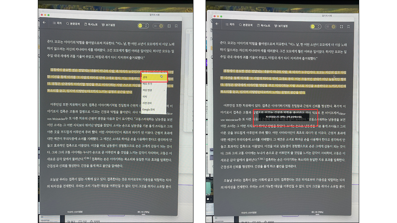 물론 전자책도 완독 한 후 문장 전체를 모아서 구글킵에 저장할 수도 있다. 하지만 일부 플랫폼은 실시간 공유는 지원하지만 문장을 한꺼번에는 복사하지 못하도록 방지하는 경우도 있다.(밀리의 서재) 따라서 전자책의 경우에는 밑줄 그은 문장을 바로 외부에 공유할 필요가 있다.