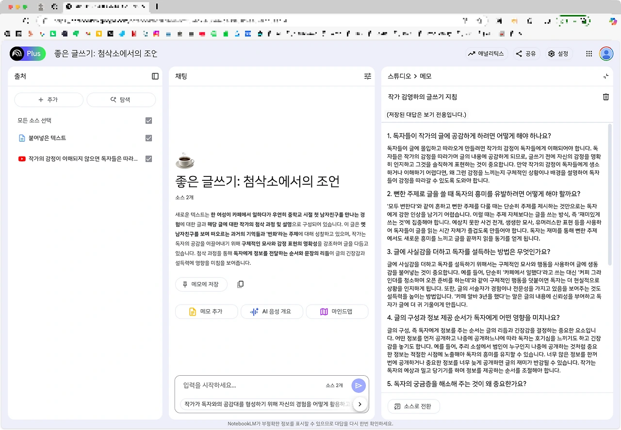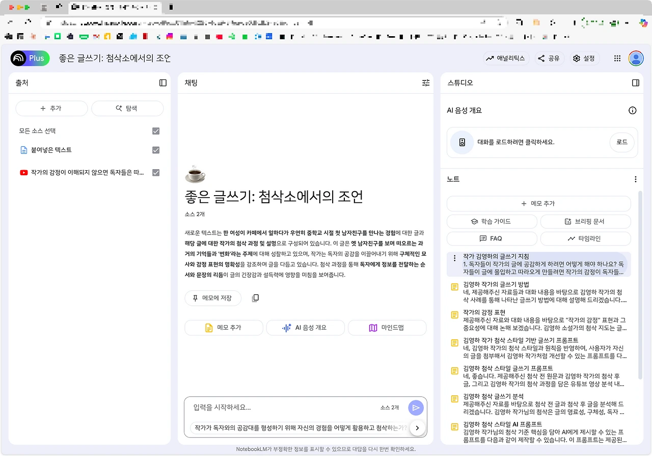 마지막으로 아래는 김영하 작가의 첨삭 스타일을 NoteBookLM이 팟캐스트로 제작한 음성이다. 이것도 틈나면 들어보자.