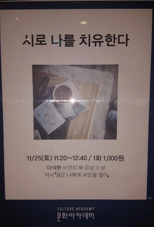 지난주에 이어 AK플라자 분당지점에서 강연을 마쳤다. 이번 강연의 주제는 시가 어떻게 '상처받은 내면을 치유할 수 있는가'였다. 시를 어떻게 하면 잘 쓸 수 있는지, 시 쓰는 기교에 관한 내용은 아니다. 내가 문단에서 인정받지도 못한 사람인데, 누군가에게 시를 가르치겠다는 건 어불성설이다. 다만, 일 년 동안 시를 읽고 쓰면서 느꼈던 감정, 시를 어떻게 읽어야 할 것인지, 내가 필사했던 시 중에서 마음을 위로하는 시를 공유하고 싶었다.