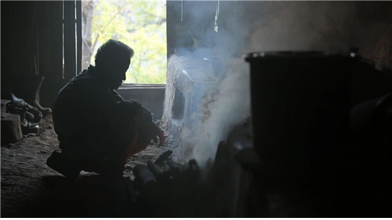 어두운 아궁이 앞에 고개를 숙인 노인은
