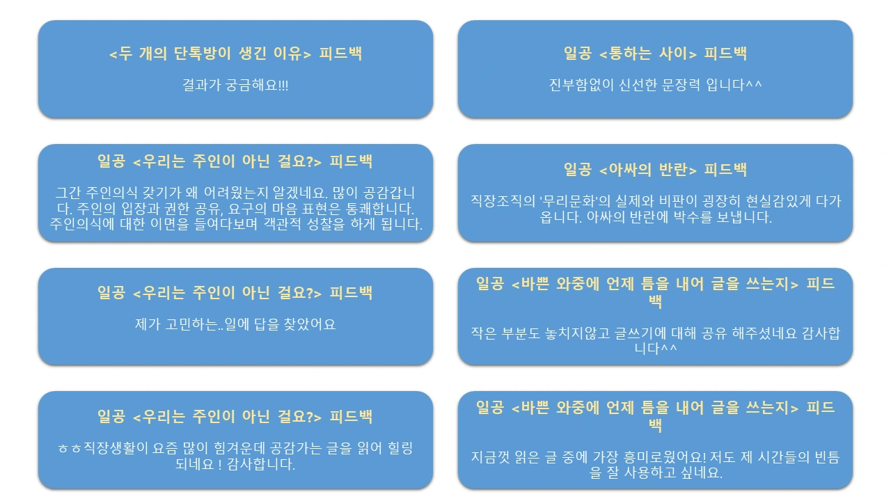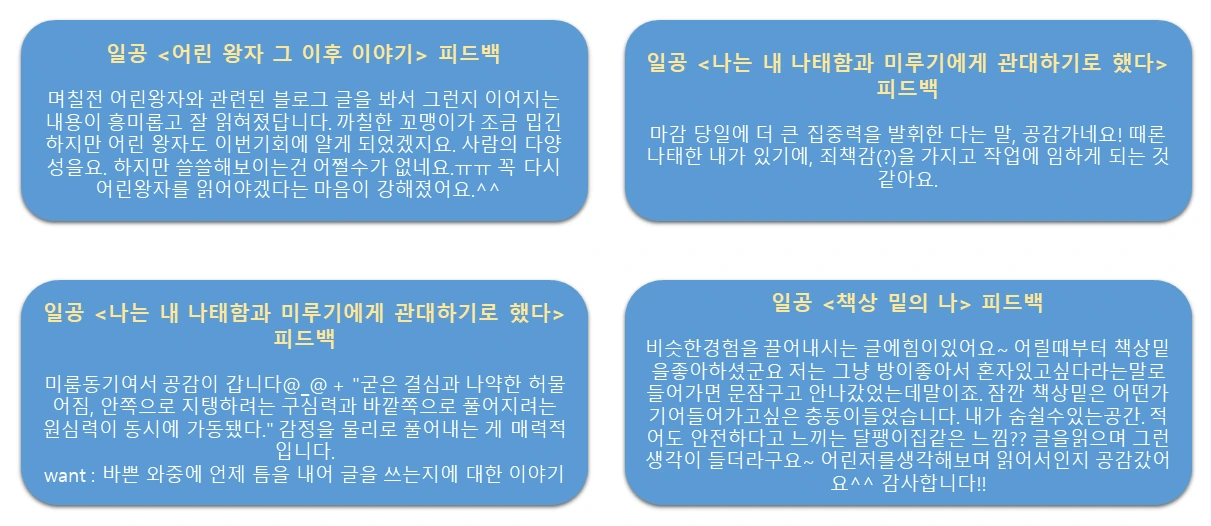 궁금하신 분들은 한 번 신청하시고 읽어 보고 판단하시는 것도 좋겠어요. 그리고 웬만하면 리퀘스트받은 내용을 쓰려고 노력하니 피드백 자세하게 주시면 더욱 고맙겠습니다.