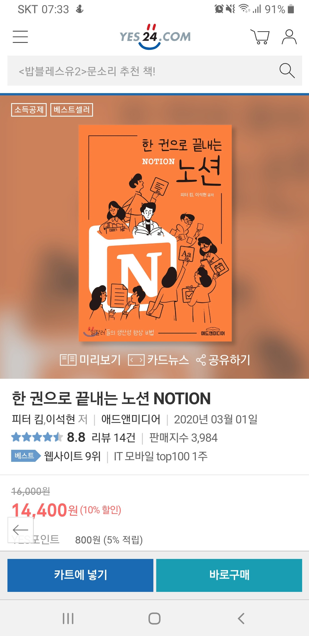 아침마다 취미처럼 Yes24에 접속한다. 출간한 책 《한 권으로 끝내는 노션》의 판매지수를 확인하기 위해. 어제보다 거의 600포인트가 상승했다. 웹사이트 부문에서 9위까지 올라섰다.