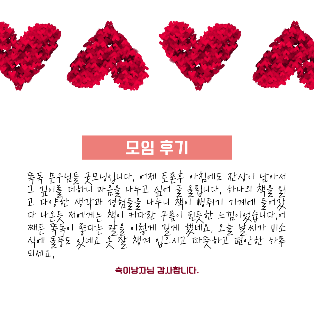 어떻게 해야 읽은 힘을 바탕으로 글을 잘 쓰게 될까를 함께 고민해보려 합니다. 어찌 보면 이 요령이라는 건 간단합니다. 책을 읽고 토론하고 이를 바탕으로 독후감이나 서평을 써보자는 겁니다. 그러다 보면 다른 글을 쓰는 능력도 키우게 되고, 이 능력이 더 확장되면 당연히 한 권의 책까지 쓸 수 있겠지요