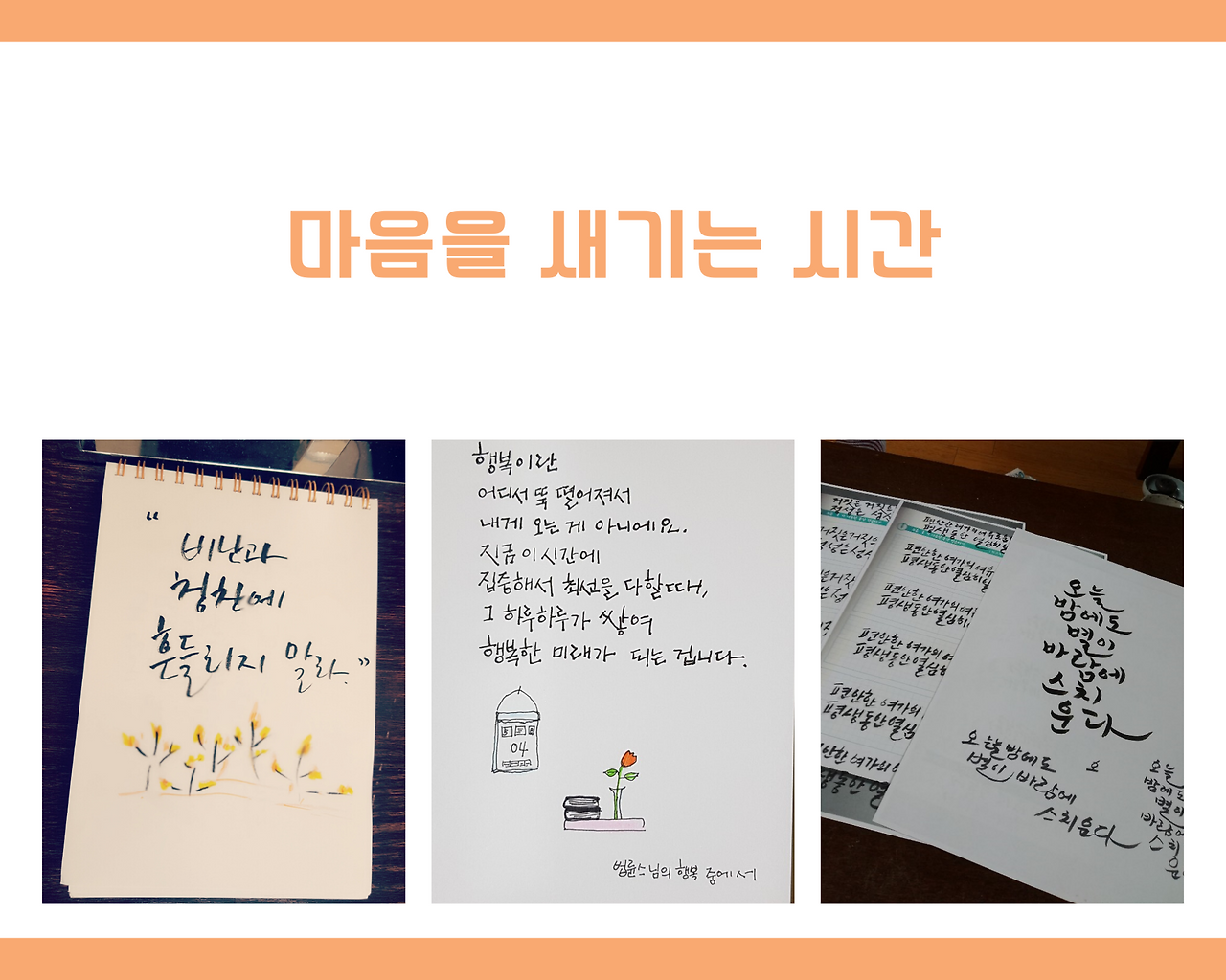 공심재 커뮤니티에서 시 필사 모임을 운영하다 보니 손으로 글을 자주 쓰는 일이 자주 벌어집니다. 쓰다 보니 더 멋지게 쓰고 싶은 욕심도 생기더군요. 끄적거리던 옛 습관은 남아있지만, 혼자 연습하다 보니 꾸준하게 진행이 되질 않습니다. 혼자 하는 것보다 함께 한다면 오래갈 수 있지 않을까 싶어요. 독학으로도 충분히 캘리그래피 작가가 될 수 있다는 걸 보여주고 싶어요.