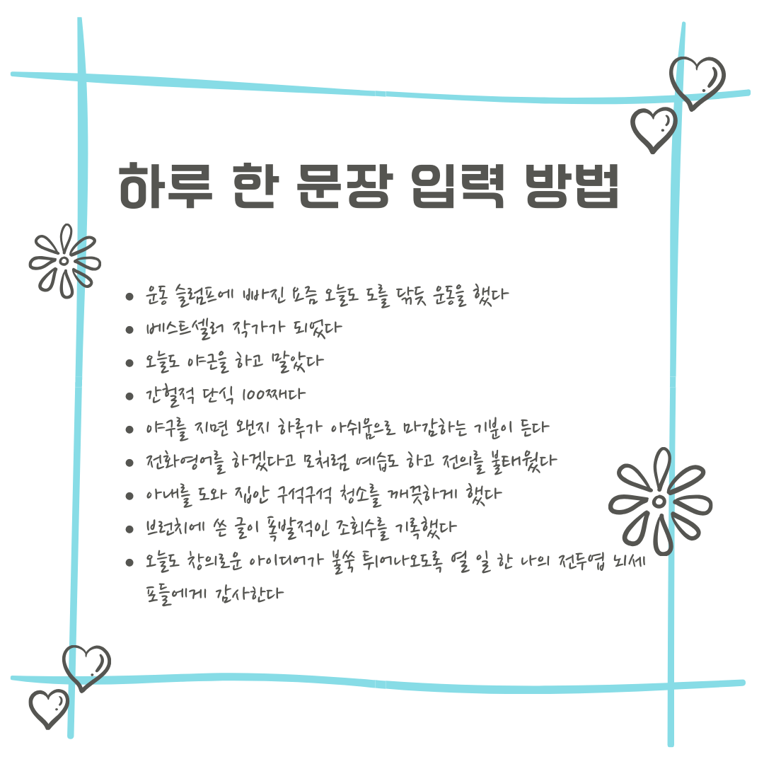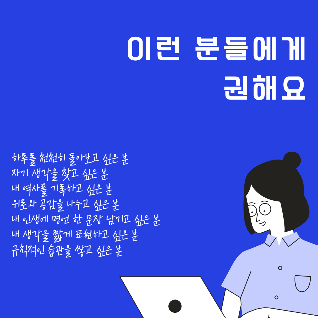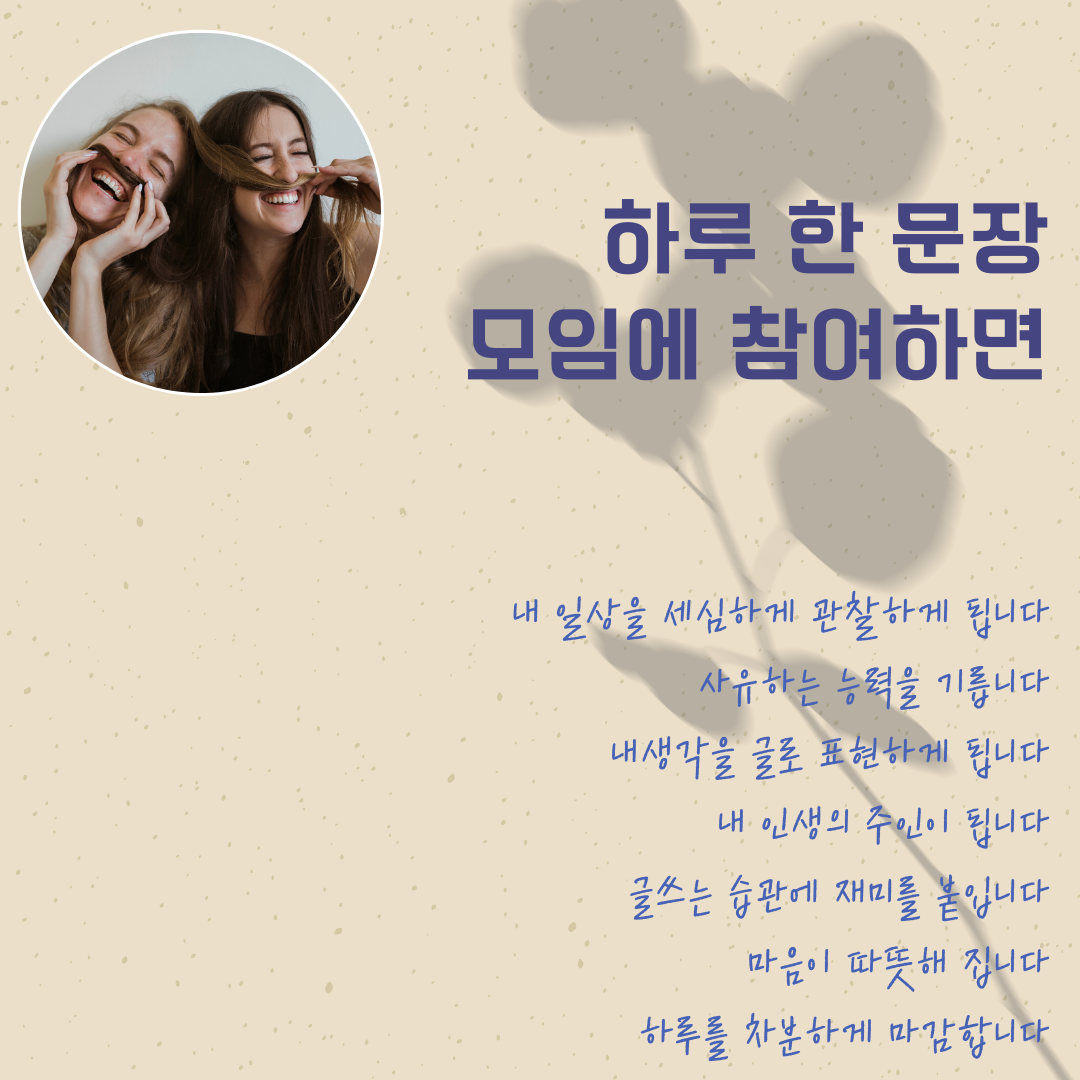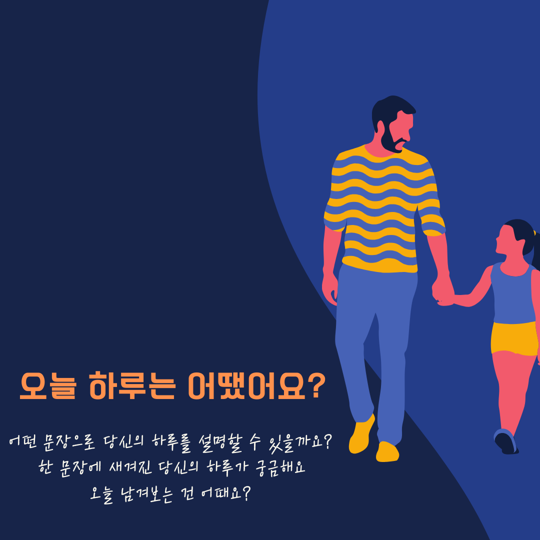 하루 한 문장 오늘 하루는 어땠어요? 어떤 문장으로 당신의 하루를 설명할 수 있을까요? 한 문장에 새겨진 당신의 하루가 궁금해요 오늘, 같이 남겨보는 건 어때요? 신청 기간 ~5/31(일)까지 시작 6/1(월)부터 6/21