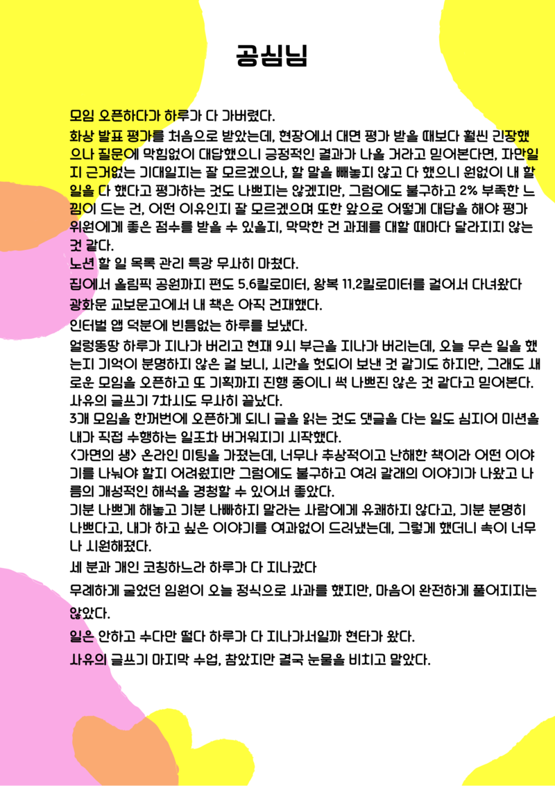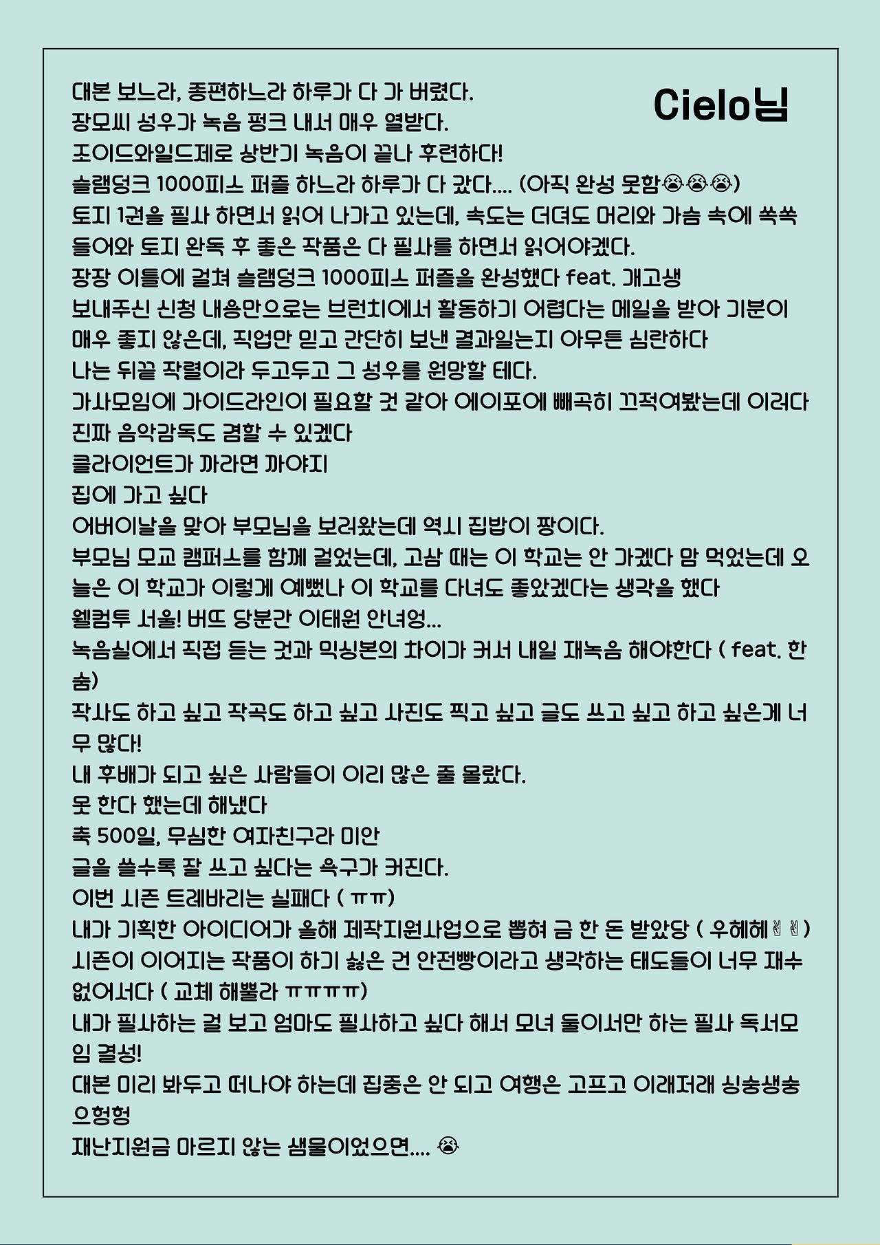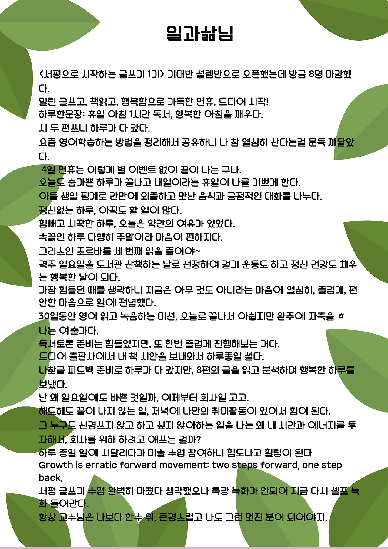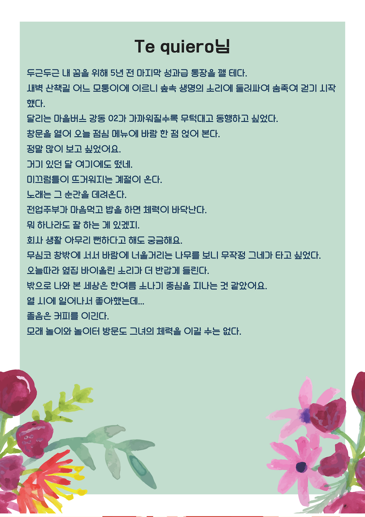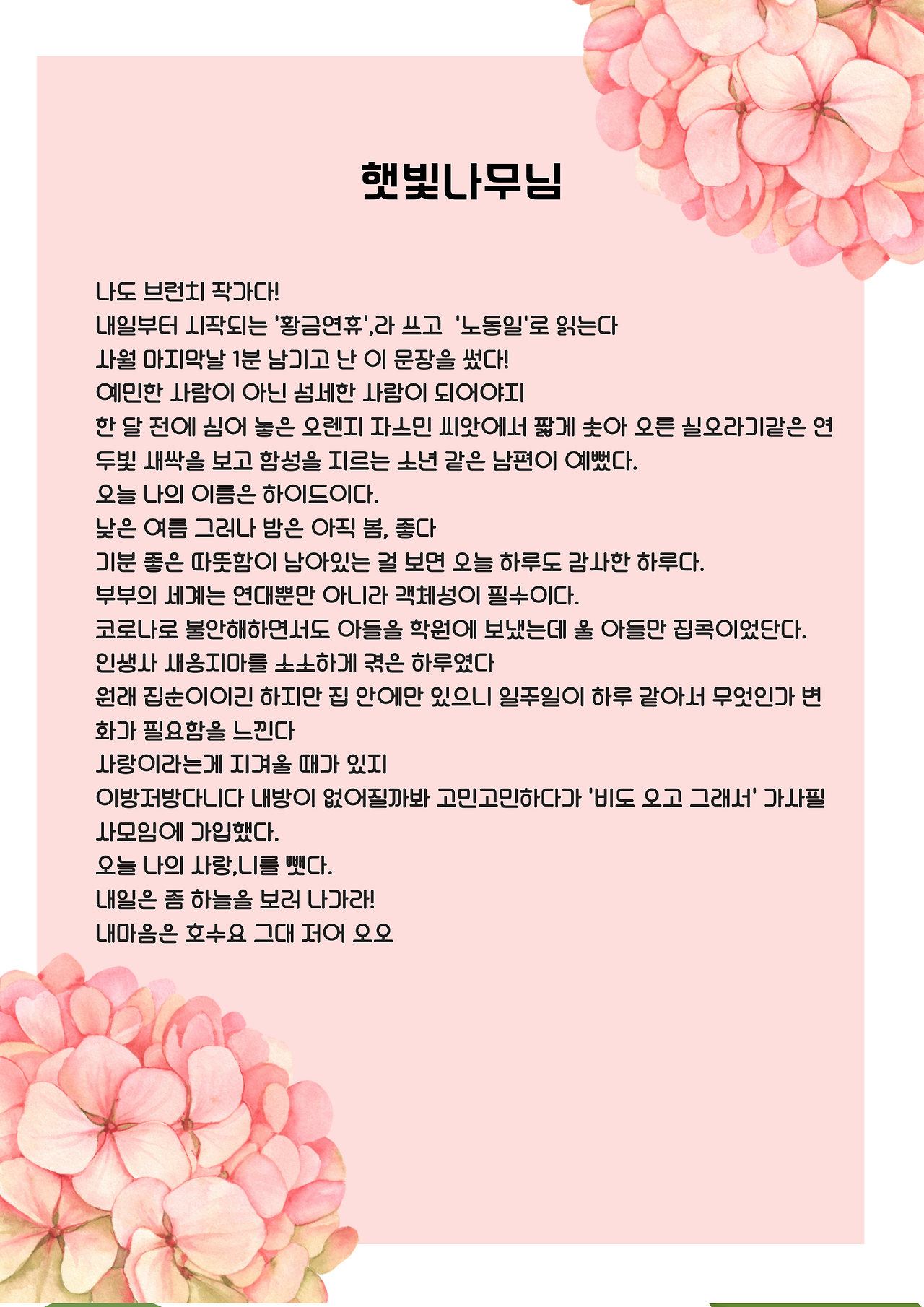 하루 한 문장 오늘 하루는 어땠어요? 어떤 문장으로 당신의 하루를 설명할 수 있을까요? 한 문장에 새겨진 당신의 하루가 궁금해요 오늘, 같이 남겨보는 건 어때요? 신청 기간 ~5/31(일)까지 시작 6/1(월)부터 6/21