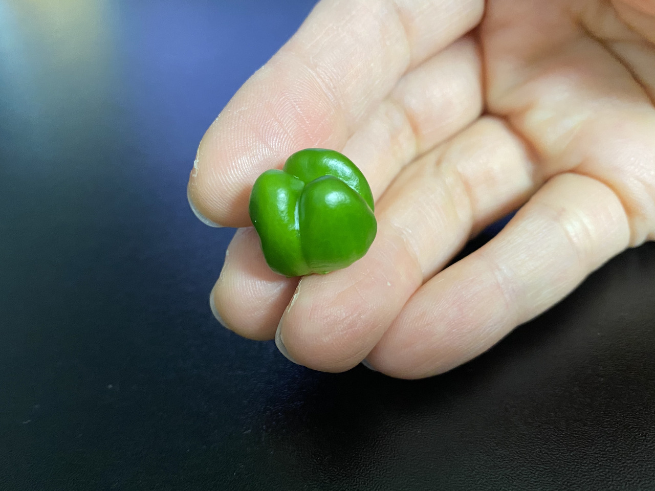 계속해서 새로운 꽃이 피어납니다. 가장 먼저 달린 열매는 색이 짙어지기 시작합니다. 자세히 보니 커다란 파프리카 바로 아래에 작은 열매가 달리기 시작합니다. 그대로 두면 두 개 다 잘 자라지 못할 것 같아 작은 열매를 따주었습니다. 크기는 작아도 영락없는 파프리카의 모습입니다. 작은 모습이 귀여워 아이들과 오래 관찰을 했습니다.