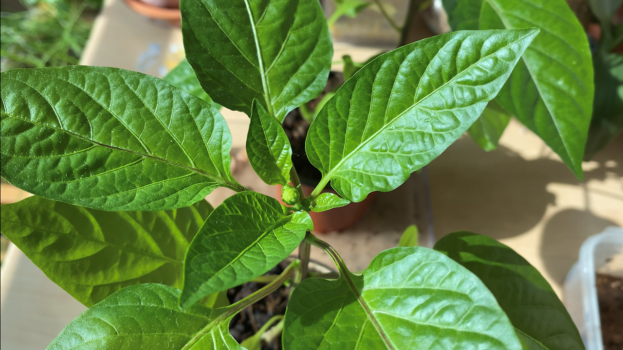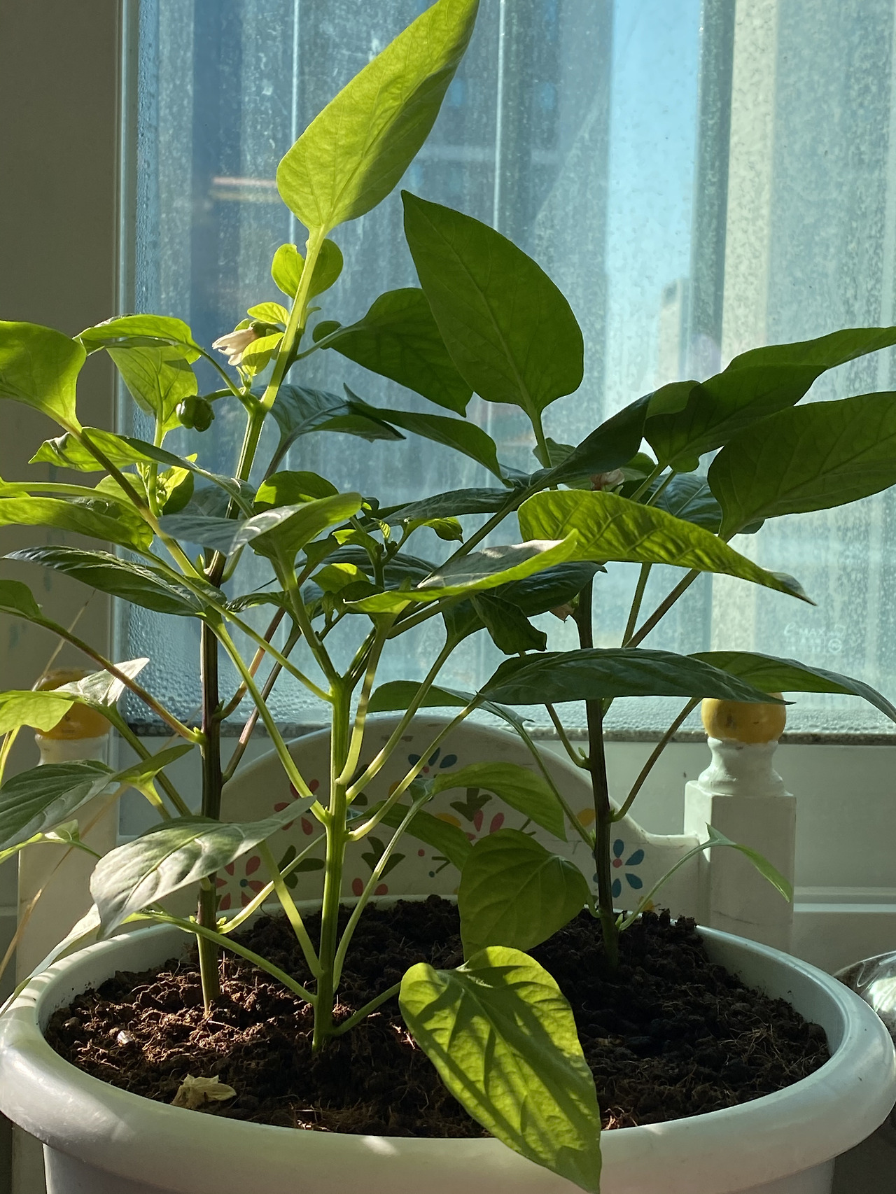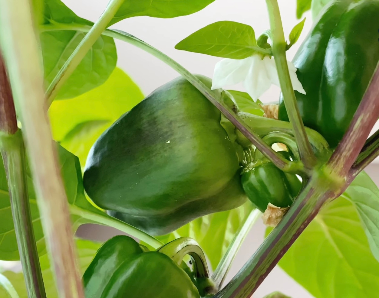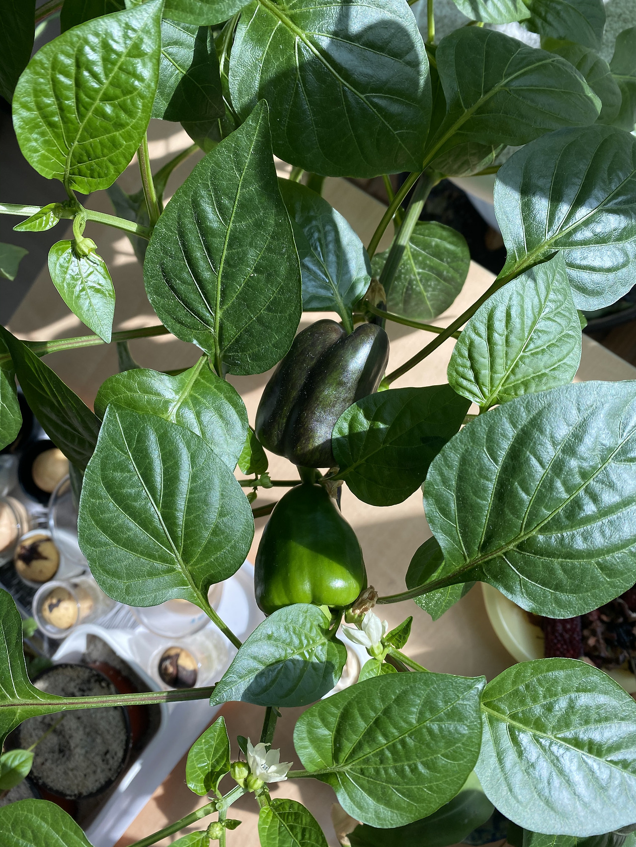 드디어 첫 번째 파프리카가 빨갛게 익어가기 시작합니다. 나머지 파프리카들은 아직 파릇파릇합니다. 씨앗 세 개를 심어 그중 두 그루의 파프리카가 자라났고 총 7개의 파프리카가 달렸습니다. 파프리카는 이제 새로운 꽃을 피워내지 않고 열매가 익어가는 것에 집중합니다.