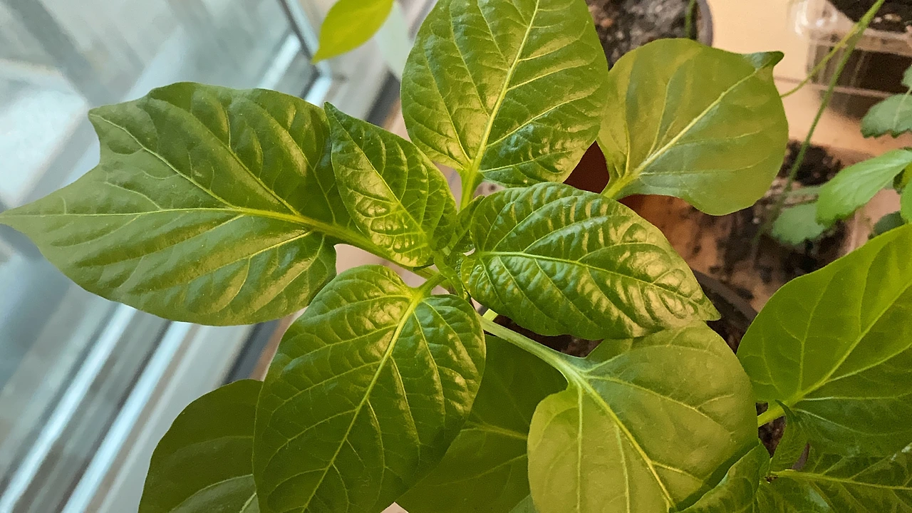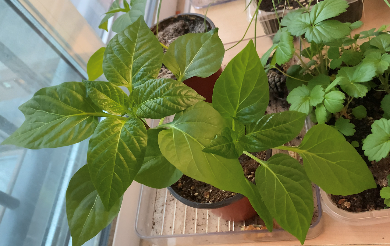 씨앗을 심고 25일가량 지나니 파프리카 잎이 열 장 이상 피어났습니다. 갓 피어난 여린 잎은 이렇게 연한 녹색에 반짝반짝 빛이 납니다.