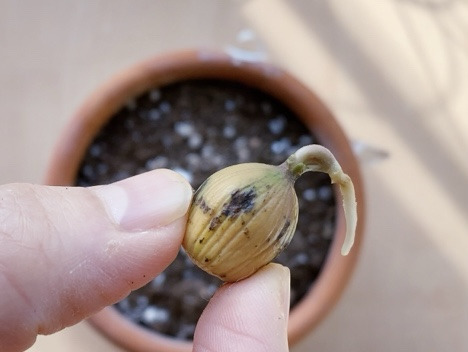 발아를 시작한 지 16일 뒤에 보니 도토리 끝에 작은 뿌리가 쏘옥 나와있습니다.