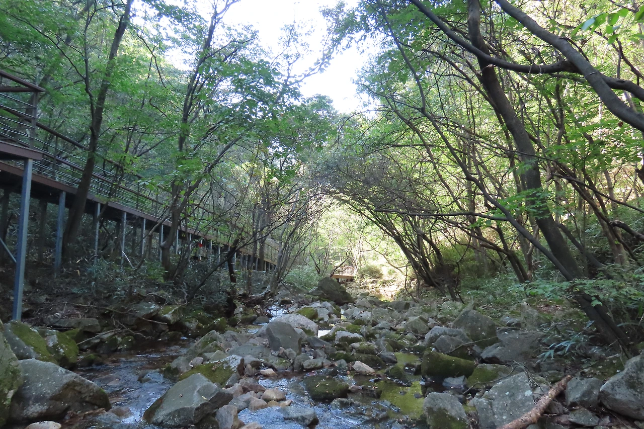 이곳 자연탐방로는 계곡 위를 관통하는 도보 다리 길입니다. 그래서 울창한 나무 사이를 지나가는 동안 힘차게 흘러가는 수락계곡 풍경을 내려다보는 멋이 뭐라 표현하기 어려울 정도로 수려합니다. 때로는 잠시 자연탐방로를 벗어나 아래로 내려와 수락계곡 물길을 가까이서 만나는 시간을 가질 수 있습니다.