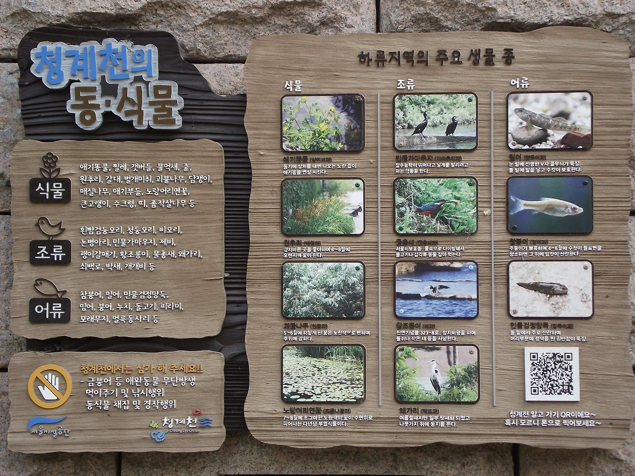 처음에는 마음 무게만큼이나 발걸음도 무거웠습니다. 걷는 내내 무덤덤하게 청계천 사진기록을 이어갔지요. 그렇게 무의미한 여정을 이어가던 도중 눈길을 사로잡는 안내문구를 오간수교 부근에서 발견했습니다. 바로 '물고기 피난처' 안내표식이었습니다. 그 순간 잠시 잊고 있었던 '길 위에서 자연 친구들 만나기' 모토가 떠올랐습니다. 깊은 마음의 잠에서 깨어났던 순간이었습니다.