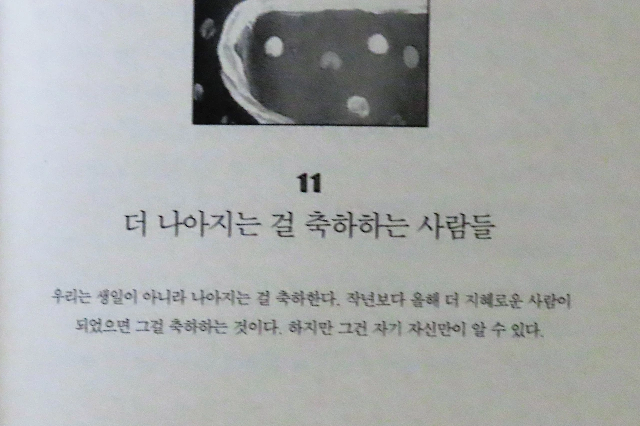 소개하고 싶은 많은 문구가 있지만 그 날 저를 가장 흔들었던 부분은 바로 '생일'에 관한 부분이었습니다. 매년 태어난 날을 축하하는 지극히 상식적인 생일 의미를 넘어, 한 사람이 일 년이라는 시간 동안 더 나은 존재로 성장했는가를 살펴보는 걸 더 중요시 여기는 그들 방식은 꼭 배워야 할 지혜였습니다. 이날 이후로 생일이 다가오면 저는 조용히 제 자신을 들여다봅니다.