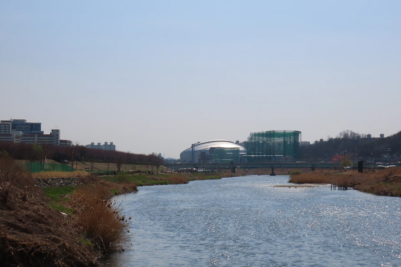 이렇게 20분 정도 놀멍 쉬멍 걷다 보면 길은 어느새 서울 둘레길 6코스인 안양천으로 이어집니다. 도림천이 생을 마치고 안양천에 합류하는 합수 구간인 이곳에서 잠시 안양천 물길을 바라봅니다. 오늘 걷기 코스가 한눈에 들어오지요. 안양천 상류 쪽으로는 고척 돔구장이 보이고, 한강 쪽으로는 목동 아이스링크가 보입니다.