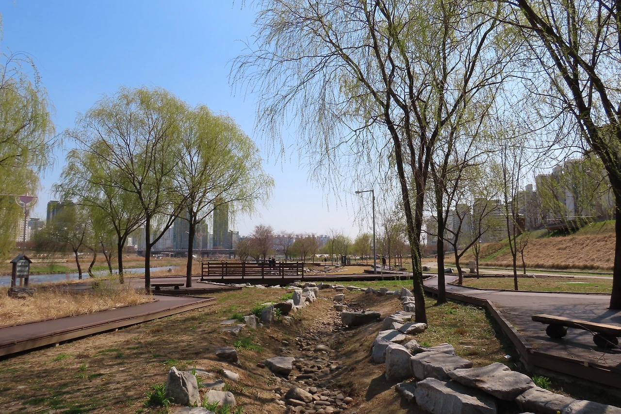 서울 둘레길 6코스 안양천 신정교-목동교 구간에는 별책부록 같은 공간이 연결되어 있습니다. 바로 안양천을 사이에 두고 양천구에서 만든 '실개천 생태공원'과 영등포구에서 조성한 '안양천 뚝방 벚꽃길'입니다. 단조로울 수 있는 안양천 걷기 여행길에 변주를 주는 그런 곳이지요.