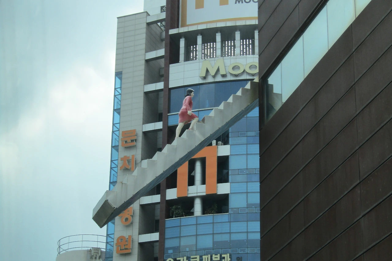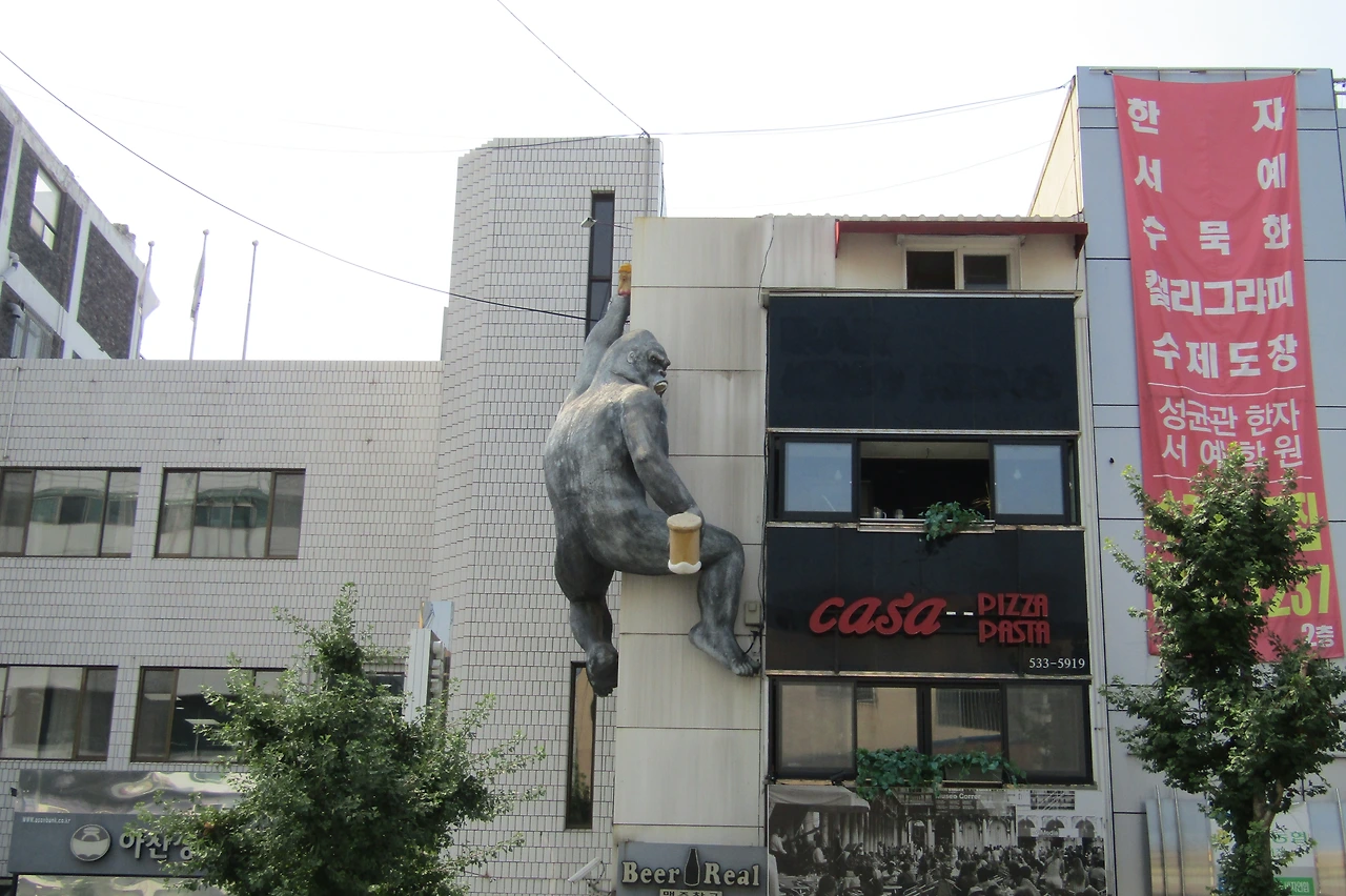 빌딩 외벽을 클라이밍 하는 사람 조형물은 스포츠 사업을 담당하는 회사 이미지에 부합하는 멋진 작품이었고, 망원경을 들여다보고 있는 탐험가는 이곳이 아트홀을 알리는데 부족함이 없는 캐릭터입니다. 그리고 맥주잔을 들고 외벽에 매달린 킹콩 친구는 골목상권에서 업종을 잘 표현한 멋진 홍보작품이기도 합니다.