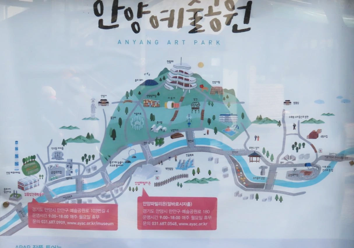 이곳은 안양예술공원 이전에 안양유원지로 불리던 곳입니다. 삼성산에서 흘러내러 오는 물로 계곡이 발달해 사람들이 휴식과 물놀이를 취하러 많이 찾아왔다고 합니다. 그러다 시대가 변하면서 전국에 있는 여느 유원지와 마찬가지로 이곳도 서서히 쇠락하기 시작했고, 지역을 되살리기 위한 도시재생 일환으로 자연과 공공미술이 만나는 프로젝트를 시작했다고 합니다.