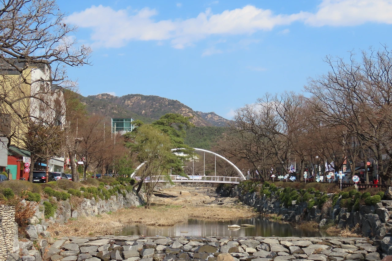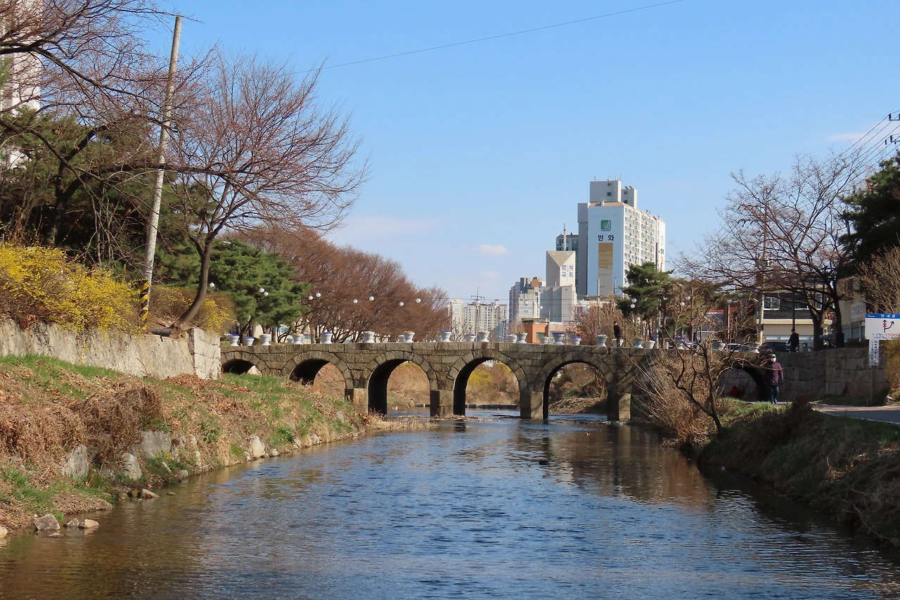 처음에는 별 기대 없이 '여기까지 왔는데 한번 보고 가자' 하는 마음으로 왔는데 막상 다리를 만나보니 제 생각이 완전히 바뀌었습니다. 덤으로 생각하고 왔는데 사실 알고 보니 또 다른 메인 코스였습니다. 멀리 보이는 아파트 건물을 배경으로 삼고 삼막천 물길 위에 굳건히 자리를 잡고 있는 아치형 다리가 주는 묘한 매력에 빠져들었지요. 그렇게 잠시 자리 잡고 앉아 이제껏 몰랐던 옛 다리를 알아가며 한국 전통미를 발견하고 느끼고 배웠습니다.