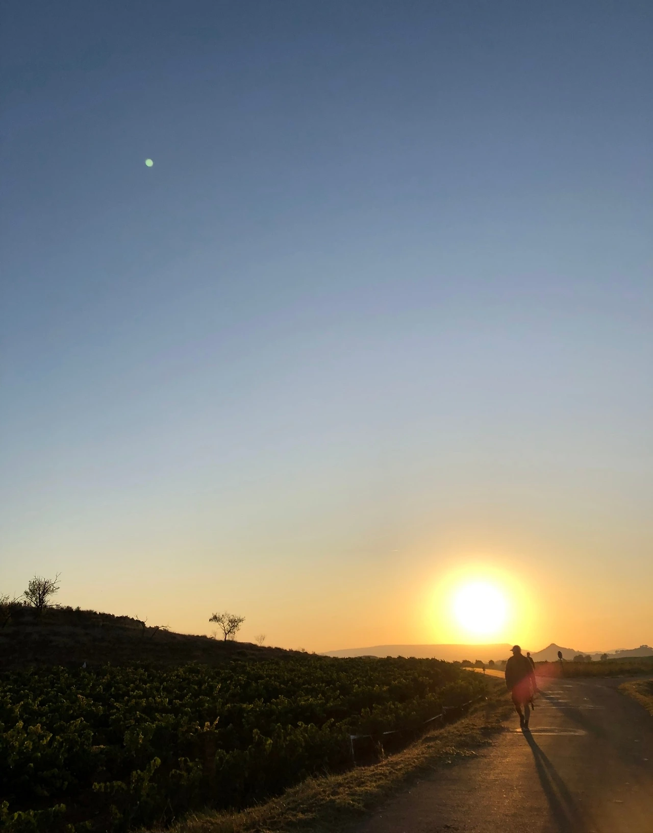 하늘은 여전히 핑크빛이었고, 곡예비행사가 남긴 것 같은 흰 줄 몇 개가 하늘을 가르고 있었다. 머지않아 언덕길 끝에 도달했고, 구불하고 길게 뻗은 완만한 내리막길이 이어졌다. 길 위에는 2,30m 간격을 두고 걷는 순례자들이 여럿 있었다. 내리막은 점점 평지로 바뀌었고, 넓은 평야를 따라 시야가 트였다. 몇 걸음 더 내디뎠을 뿐인데 태양이 곧 떠오를 듯이 황금빛으로 하늘을 밝혔다. 나는 카메라를 들고 사진과 동영상을 번갈아 가며 연신 촬영을 하며 길을 걸었다. 등 뒤에서 곧 태양이 선명하게 떠오를 터였다. 나를 앞서 걷는 사람들 또한 길을 걸으면서 힐끔힐끔 등 뒤를 돌아보며 일출을 고대하고 있었다. 그중 한 사람이 눈에 띄었다. 그는 시간의 흔적을 고스란히 담고 있는 하얀 머리의 여성 동양인 순례자였다. 그는 앞으로 나아가는 순례자들과 달리, 길 한복판에 멈춰 서서 은은한 미소를 지으며 내 뒤에서 떠오르는 태양을 지긋이 바라보고 있었다. 너무나 몽환적이고 초현실적인 모습이었다. 그는 나에게는 없는 여유를 가지고 있었다. 몹시 편협한 생각일 수도 있지만, 분명 나보다 나이가 많아 보였고, 그러므로 더 고된 여정이었을 텐데, 힘든 와중에도 저런 여유를 마음껏 부릴 수 있다는 사실에 부러운 마음과 부끄러운 마음이 들었다. 길을 걷는 와중에 멈춰 서서 태양을 본다는 일은 무척 사소한 일 같지만, 나에게는 결코 사소한 일이 아니었다. 그는 분명 인생에서 무엇이 진짜 중요한 것인지 알고 있을 것만 같았다. 그와 가까워졌을 때 나는 ‘부엔 까미노’라고 인사를 건네고 싶었지만, 그조차 그의 감상을 깰 것만 같아 그냥 지나쳤다.