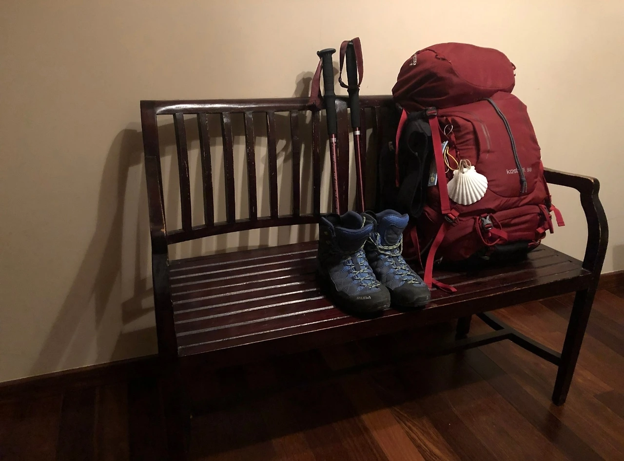 9월을 마무리하고 10월의 첫날 산티아고로 가게 되었다. 버스를 타기 위해 일찍 일어나 나갈 채비를 마친 후, 숙소 한편에 있는 의자에 배낭과 등산 스틱, 등산화를 가지런히 놓고, 앉아서 사진을 찍었다. 마음이 뭉클했다. 이제 조금씩 마지막이라는 실감이 밀려왔다. 그러다가 시간이 촉박해서 서둘러 숙소를 나섰다.