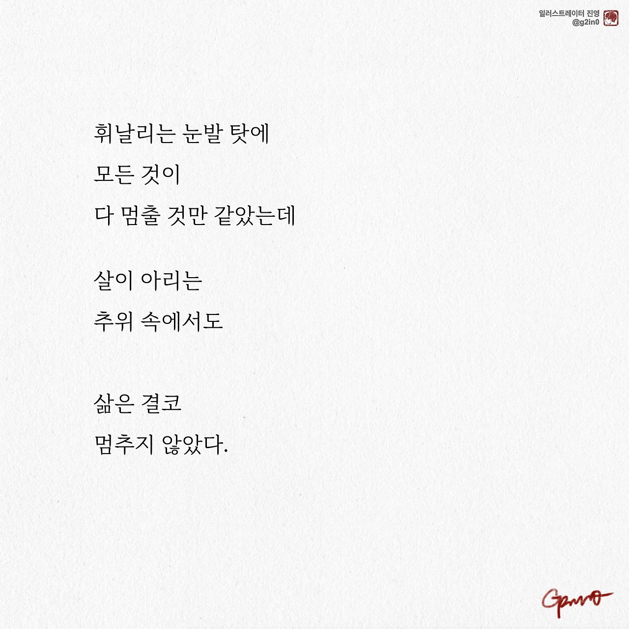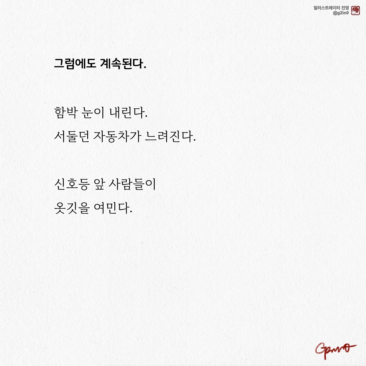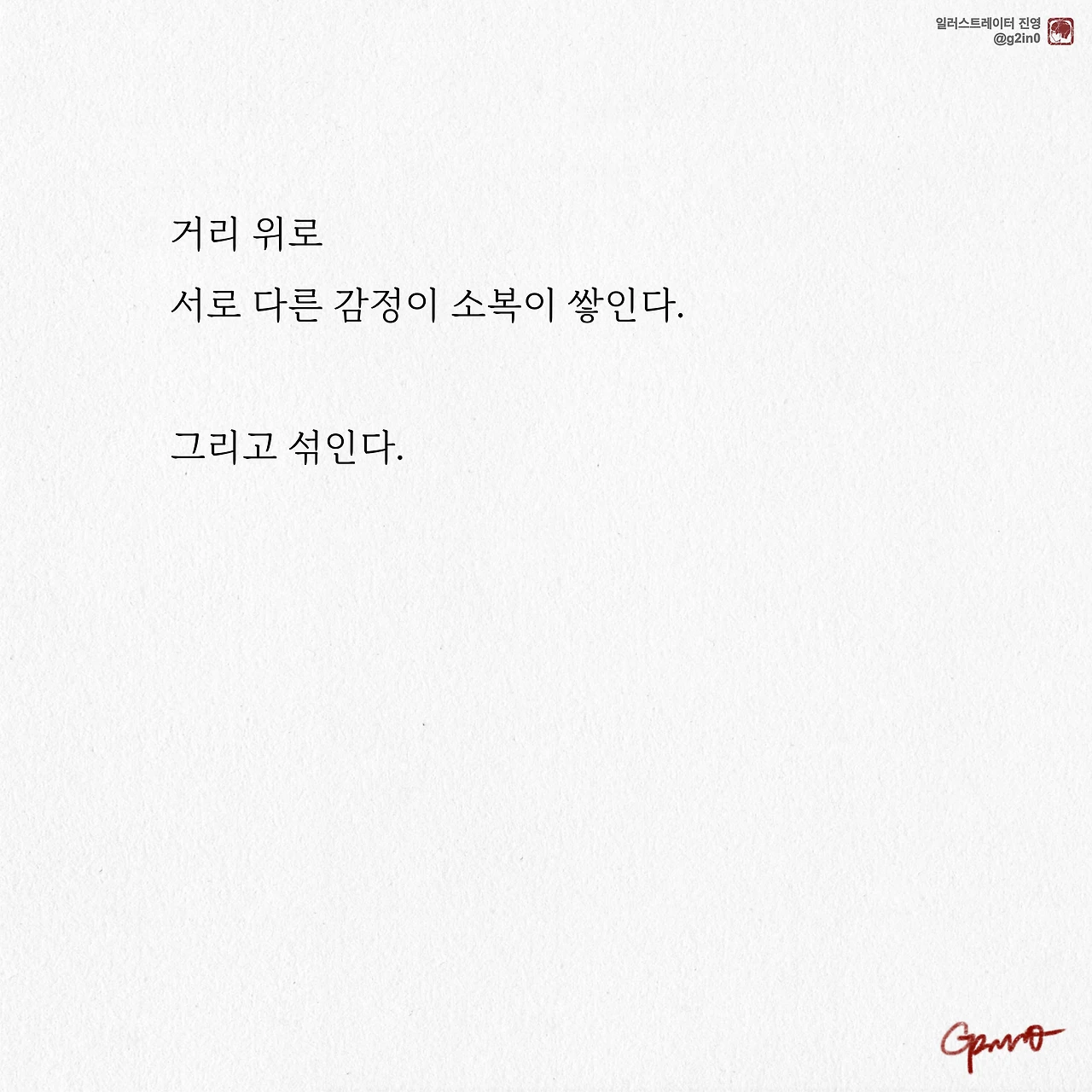 감성 글을 쓰고, 그림을 그립니다. 저의 작품이 누군가에게 그저 순간의 '기쁨', 혹은 '슬픔'이 되었다가 사라지기보다는 오랫동안 '좋음'으로 함께 했으면 좋겠습니다.