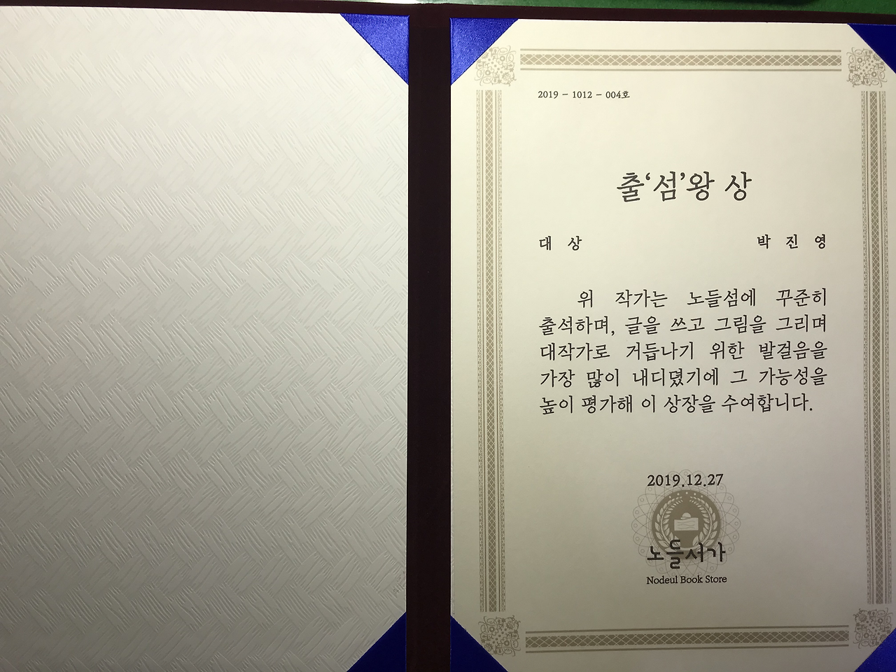 노들서가의 마지막 네트워킹에서 나는 “출섬왕”이라는 상을 받았다. 3개월간 노들섬에서 가장 많은 출석 일수를 채운 사람에게 주는 상이 었다. 그도 그럴 것이 나는 3개월간 거의 모든 날을 빠지지 않고 출석했다. 심지어 주말에도 자주 나왔다. 나는 노들서가가 좋았다. 좋으니까 자주 왔고, 자주 오니 자연스레 출석왕이 되었다.