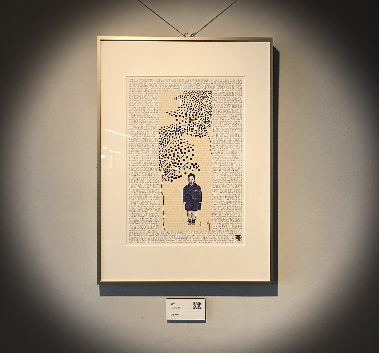 시리즈 '윤춘(輪春)'의 배경에는 9천 자~1만 자의 글이 빼곡하게 쓰여 있으며,