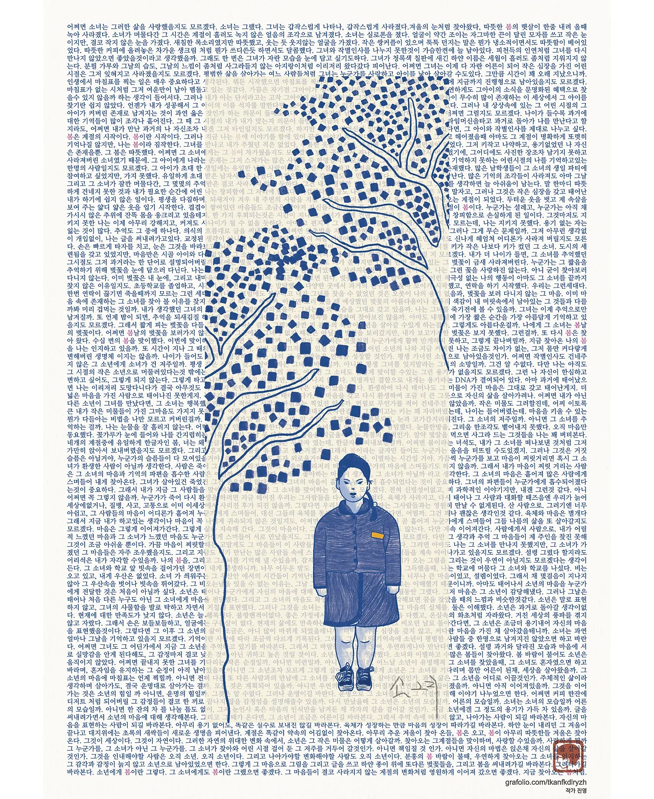 '소녀'라는 작품에는 한 소녀에 대한 소년의 이야기가 담겨있습니다. 무질서함을 표현하기 위해, 맞춤법이 틀려도 멈추지 않고, 의식의 흐름대로 글을 써 내려갔습니다. 그래서 처음에는 소녀와 소년의 이야기가 진행되다가, 이야기가 전혀 다른 길로 샐 수도 있습니다.