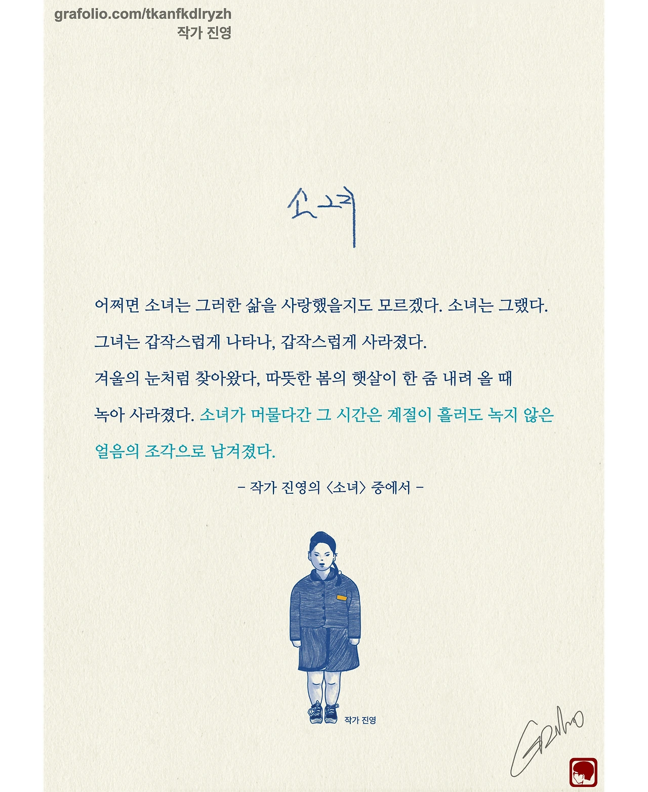 '소녀'라는 작품을 통해 질서와 무질서를 느껴보세요. 그리고 쳇바퀴 돌듯 돌아가며 반복되는 봄이라는 현상에 대해 당신의 기억 속에 있는 어떤 소년과 어떤 소녀의 추억을 되돌아보세요.