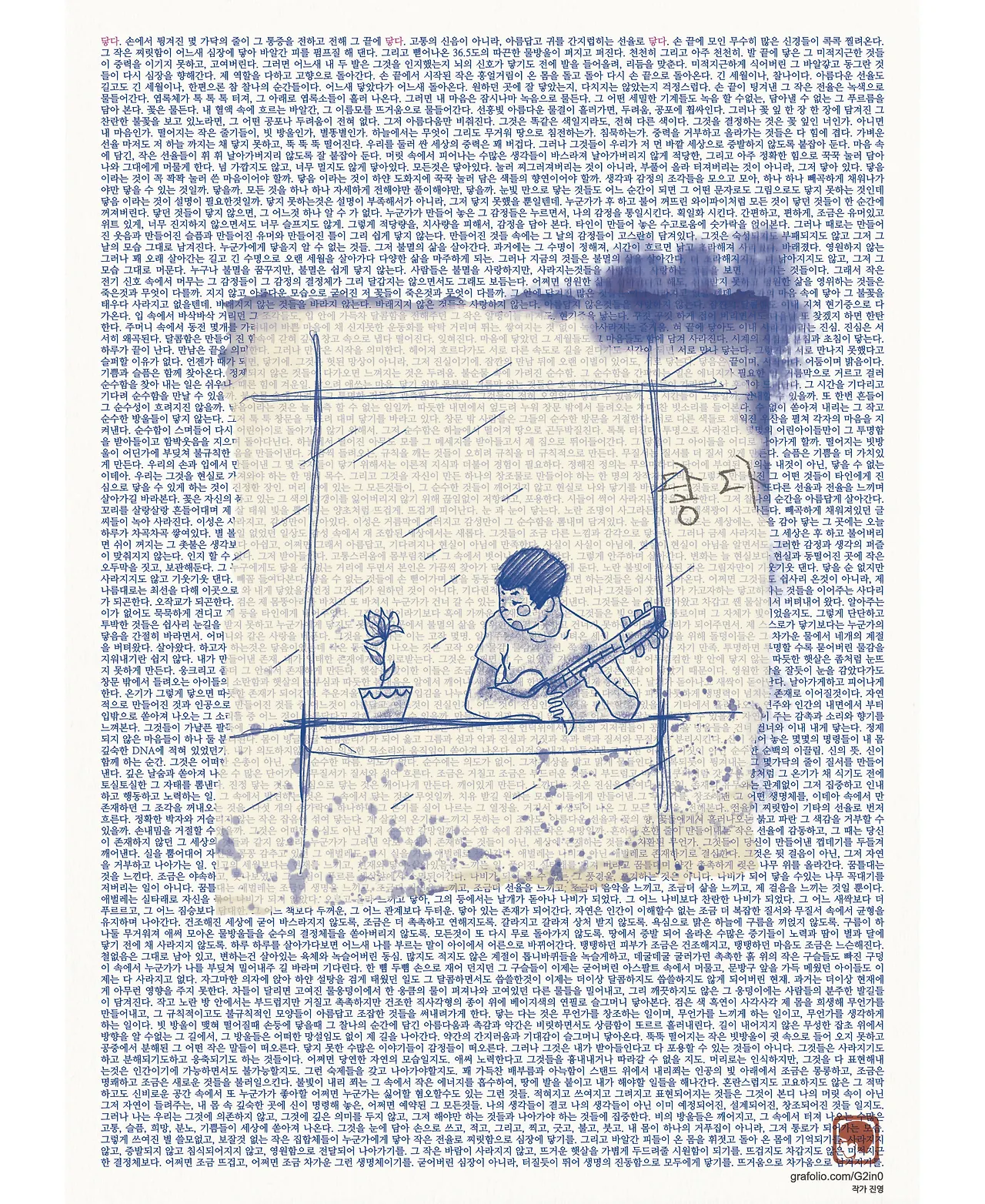 아마 이 작품을 보는 대부분의 사람들도 배경에 쓰인 글을 전부 다 꼼꼼하게 읽어보진 않을 겁니다. 작은 글씨, 빼곡하게 쓰인 글, 틀린 맞춤법, 무슨 말인지 이해하기 힘든 내용으로 구성된 이 글을 읽는 일은 아주 고되고, 힘든 시간일 겁니다. 아마 작품 속의 글을 어느 정도 읽다 보면, 겉보기에는 질서 정연해 보였으나, 그 실상은