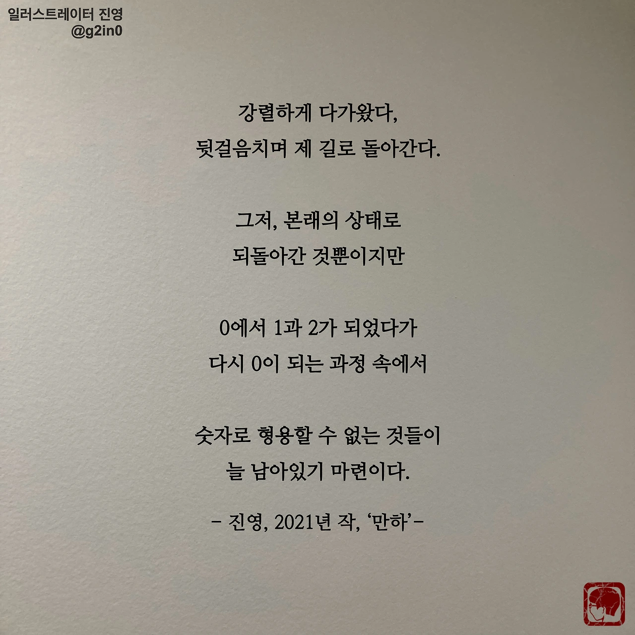 감성 글을 쓰고, 그림을 그립니다. 저의 작품이 누군가에게 그저 순간의 '기쁨', 혹은 '슬픔'이 되었다가 사라지기보다는 오랫동안 '좋음'으로 함께 했으면 좋겠습니다.